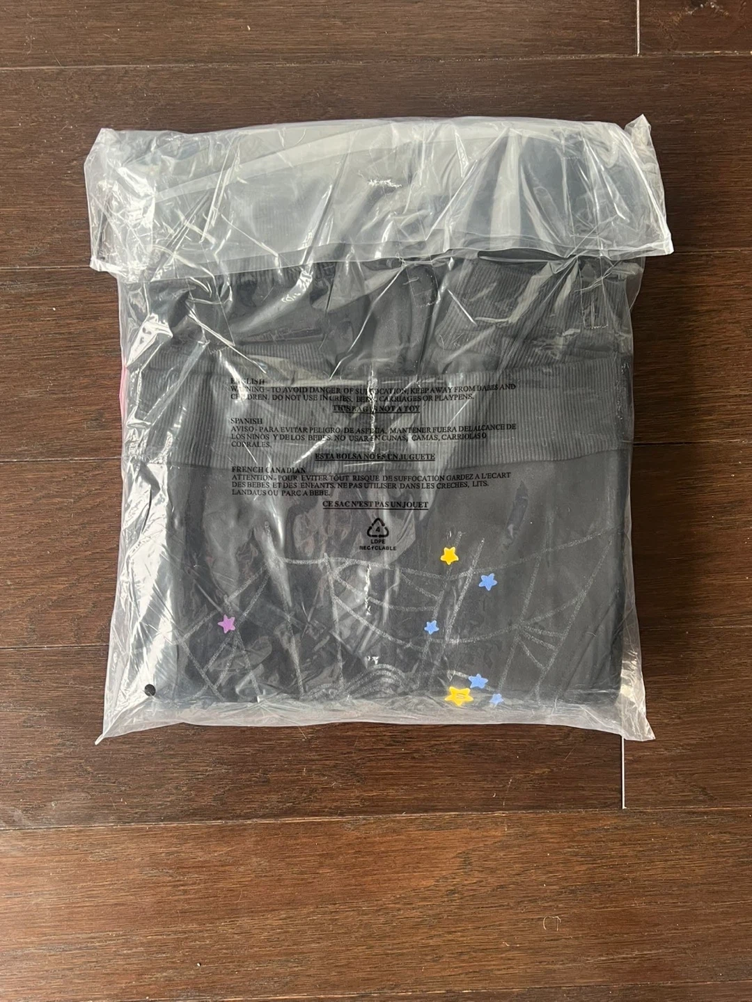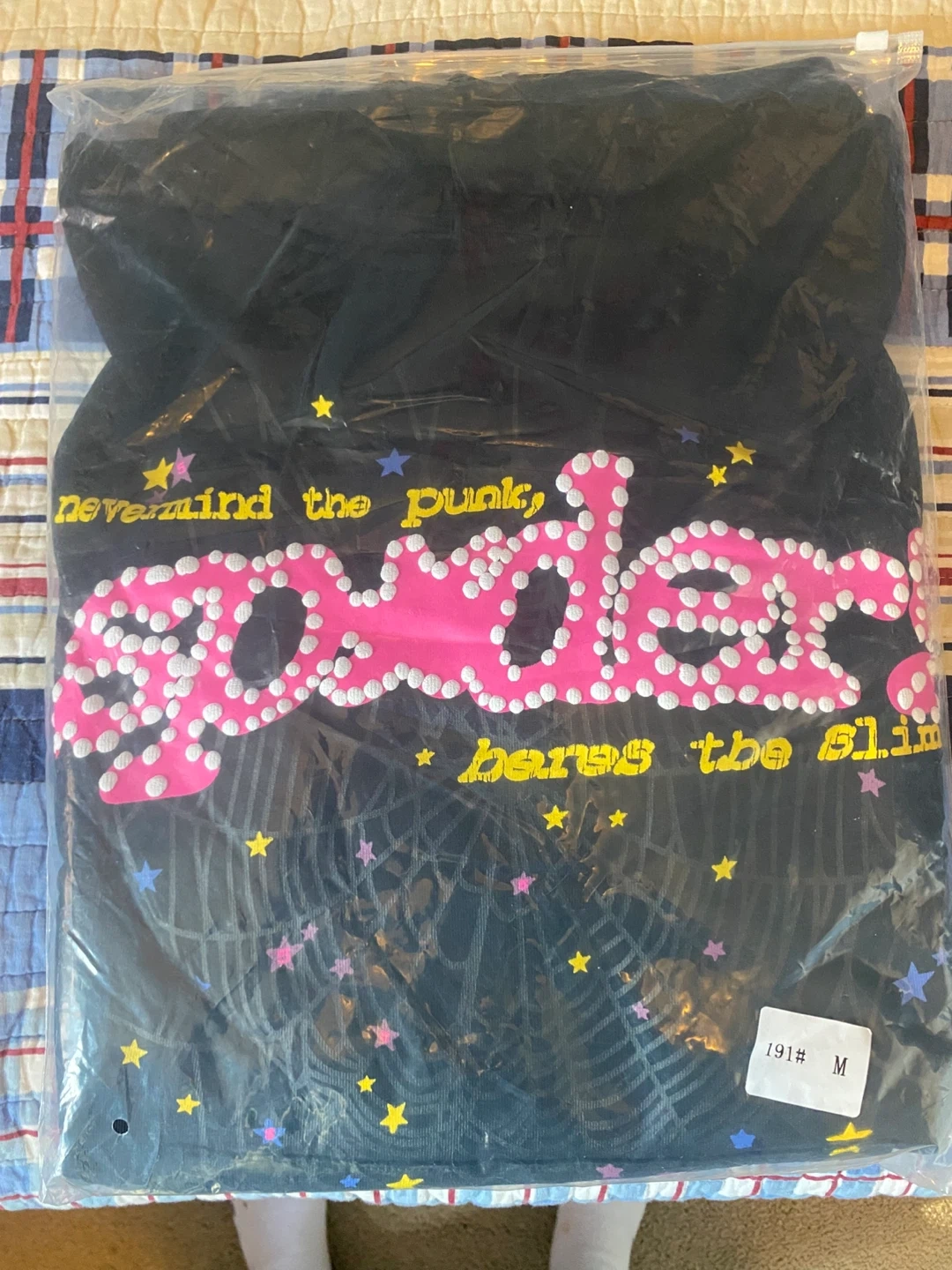 Selling a brand new SP5DER hoodie, still in the original packaging! It's a black hoodie with the phrase "nevermind the punk, here's the slime" and the word "SP5DER" in pink. There are also some colourful stars on the hoodie. Size is M. Check my profile for more clothing options
