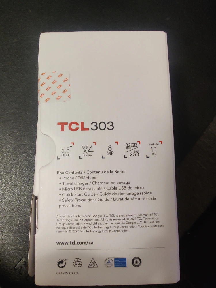 Selling a brand new TCL 303 smartphone! It comes in its original box with all included components: phone, travel charger, micro USB data cable, quick start guide, and safety precautions guide. It's an Android 11 phone with a 5.5" HD+ display, a quad-core processor, 32GB of storage, and 2GB of RAM. The camera is 8MP.