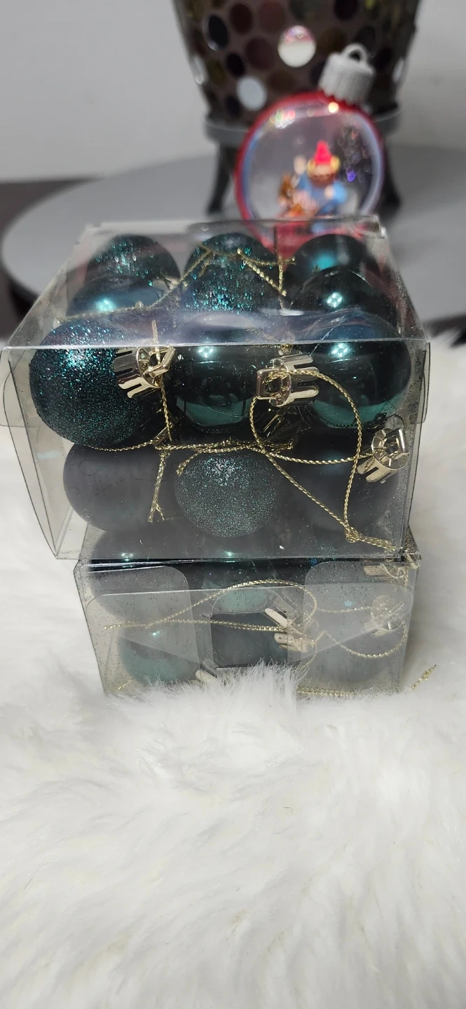 246I'm selling 2 boxes of a set of teal small size Christmas ornaments. They are brand new and come in a box of 9, puchased on Wayfair for around $15.00. There are 3 different colors of teal, from light to dark, and one that is full if glitter. Perfect for adding a touch of elegance to your tree this holiday season!