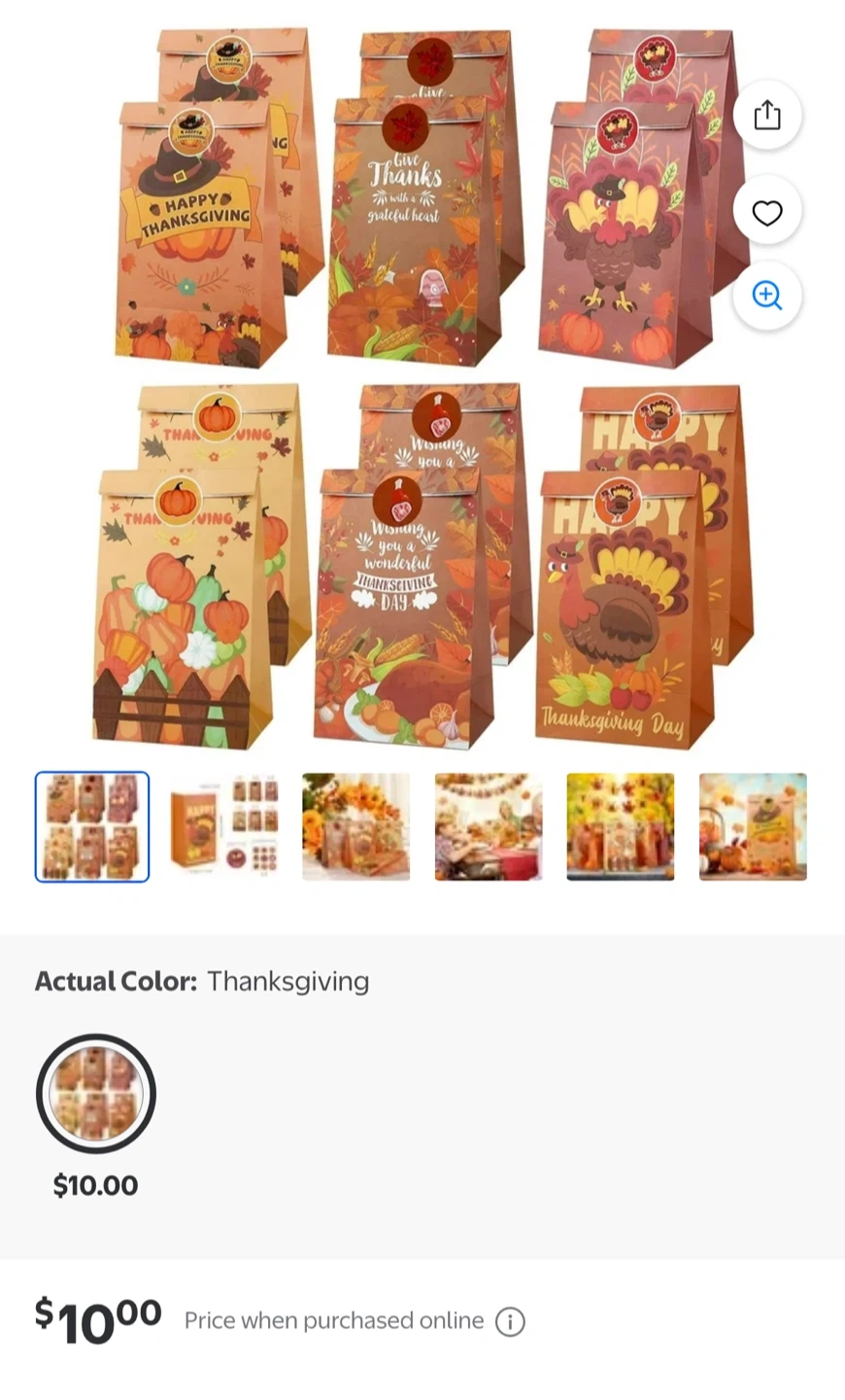 106I'm selling a brand new set of Thanksgiving-themed paper bags! This is a pack of 12, perfect for treats or small gifts. The bags are 200 x 120 x 80 mm in size. Each bag is decorated with festive fall designs, including pumpkins, leaves, and turkeys. Also comes with a sheet of stickers to seal the bags!