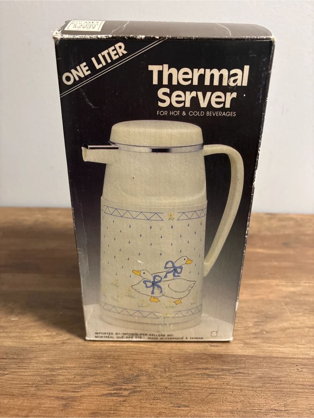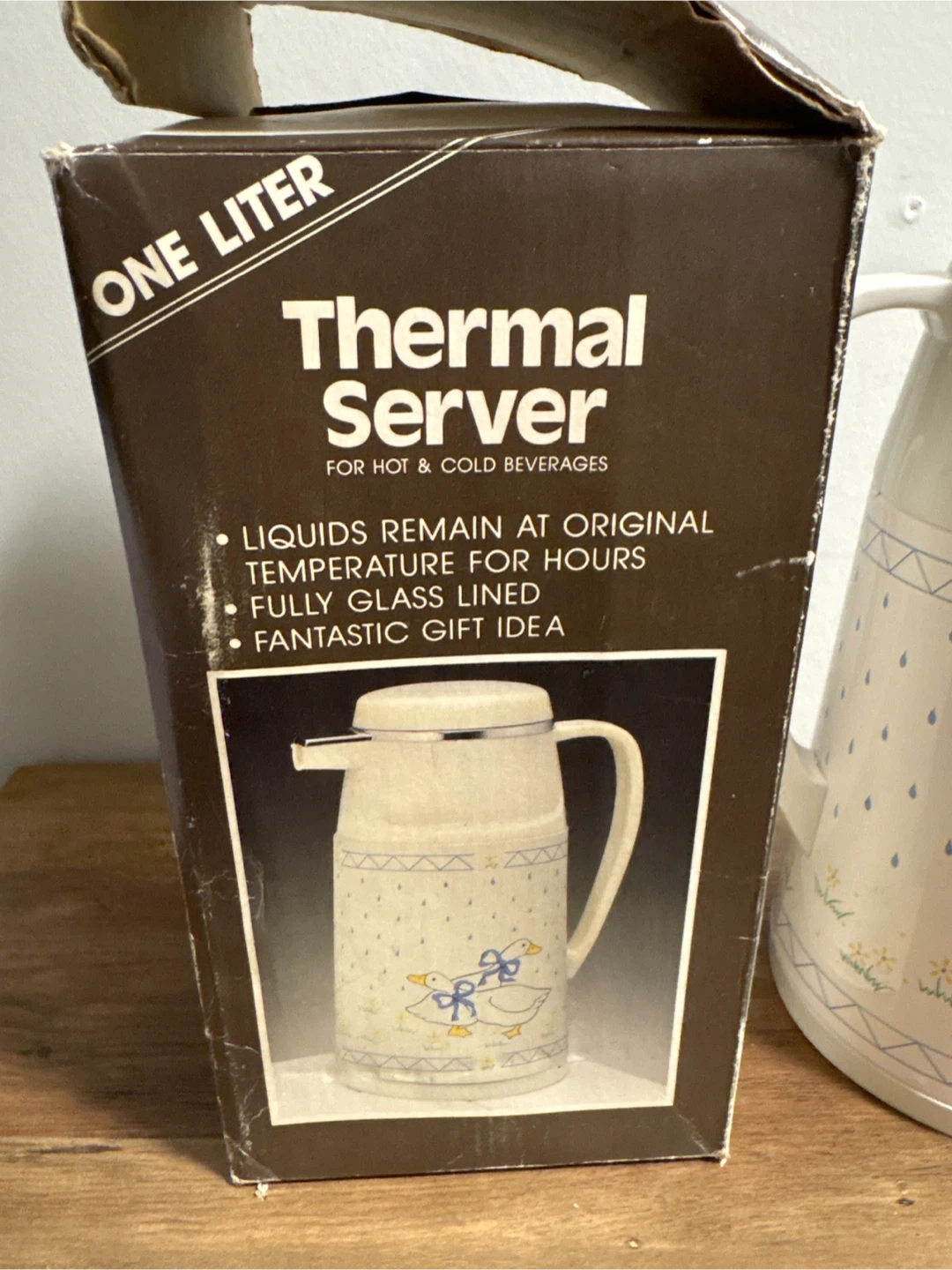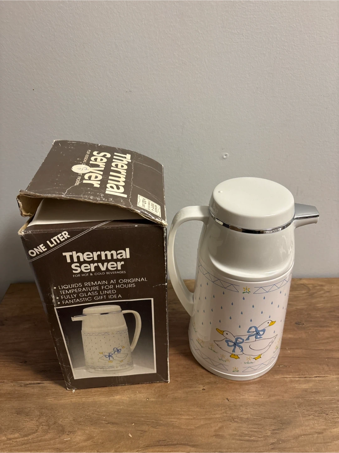 98Keep your hot and cold beverages at the original temperature with this vintage thermal server! It holds one liter and features a cute duck design. The server is fully glass lined, ensuring your drinks stay at their original temperature for hours. Comes with its original box, making it a fantastic gift idea or a charming addition to your kitchen