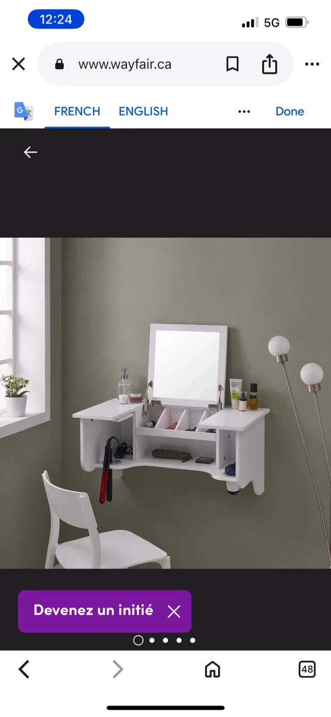 137Wayfare Price $539.99 This wall-mounted floating vanity table is perfect for saving space! It features a sleek, white design with a flip-top mirror and plenty of storage compartments for your makeup and accessories. The dimensions are approximately 31 3/4" wide, 16" high, and 18" deep. It's a great addition to any bedroom or bathroom