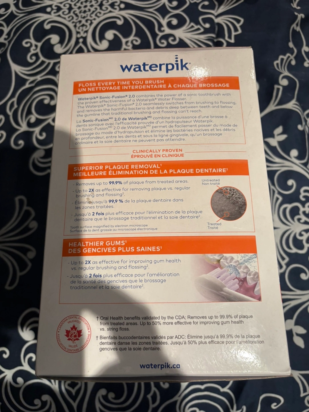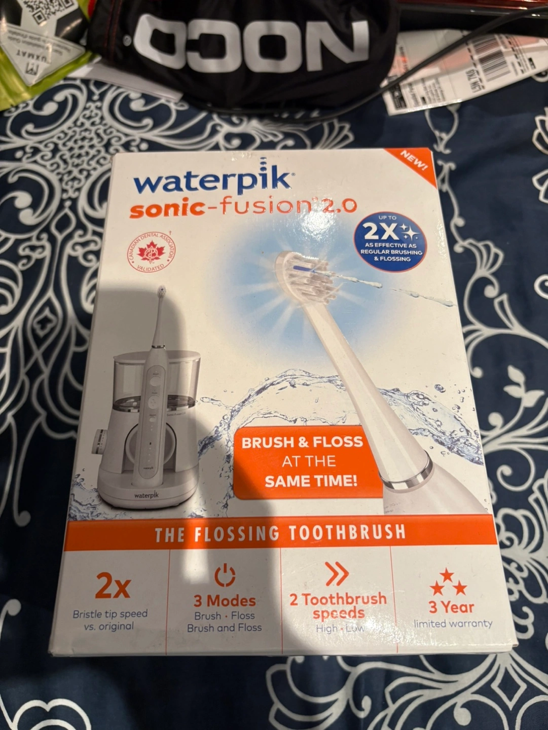 New Waterpik Sonic-Fusion 2.0 flossing toothbrush. Brushes and flosses simultaneously. Three modes, two speeds, 10 pressure settings.