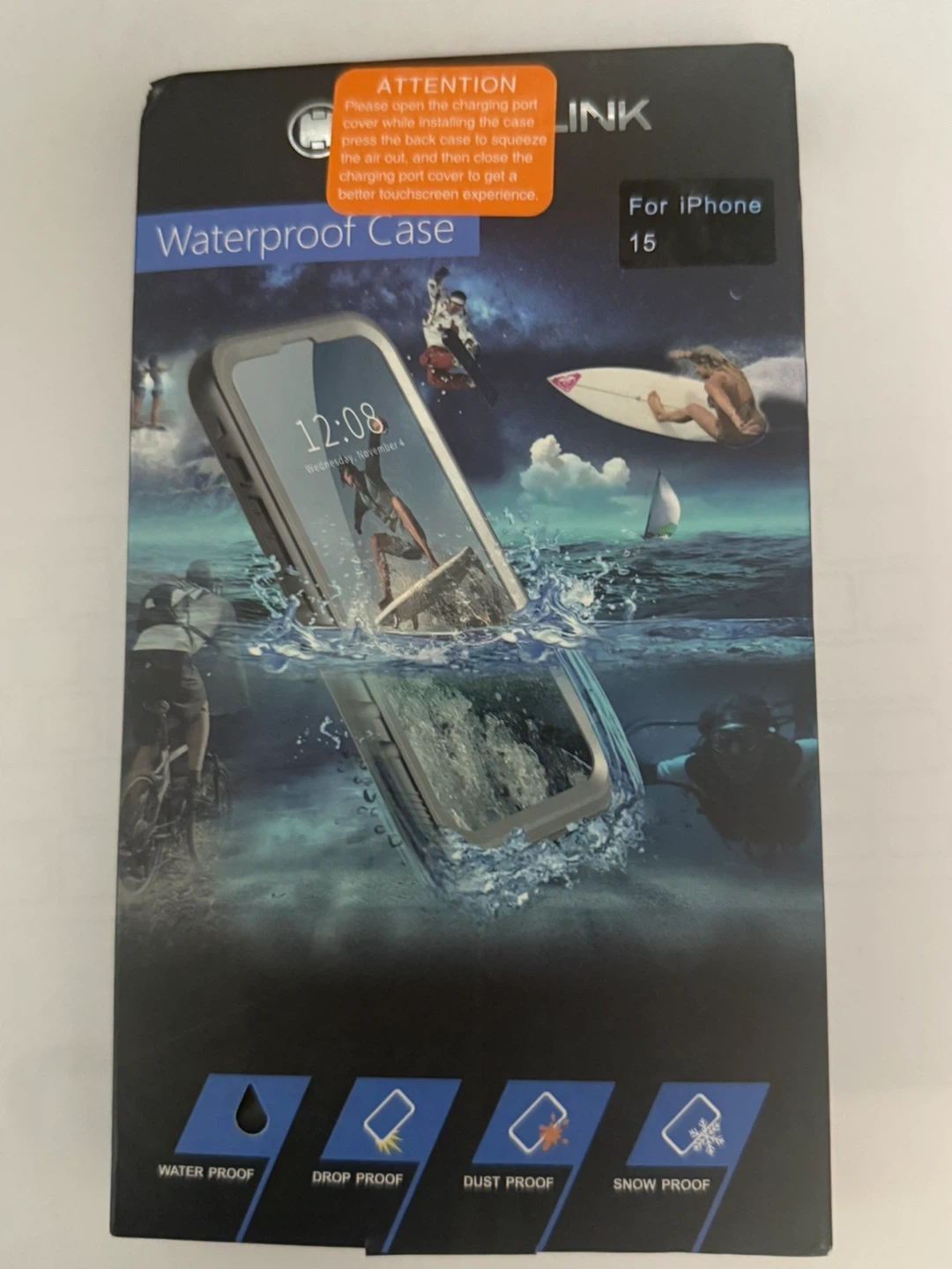 60Selling a brand new waterproof case for the iPhone 15! This case offers great protection against water, drops, dust, and snow. It's designed to provide a better touchscreen experience. Just open the charging port cover while installing the case, press the back case to squeeze the air out, and then close the charging port cover