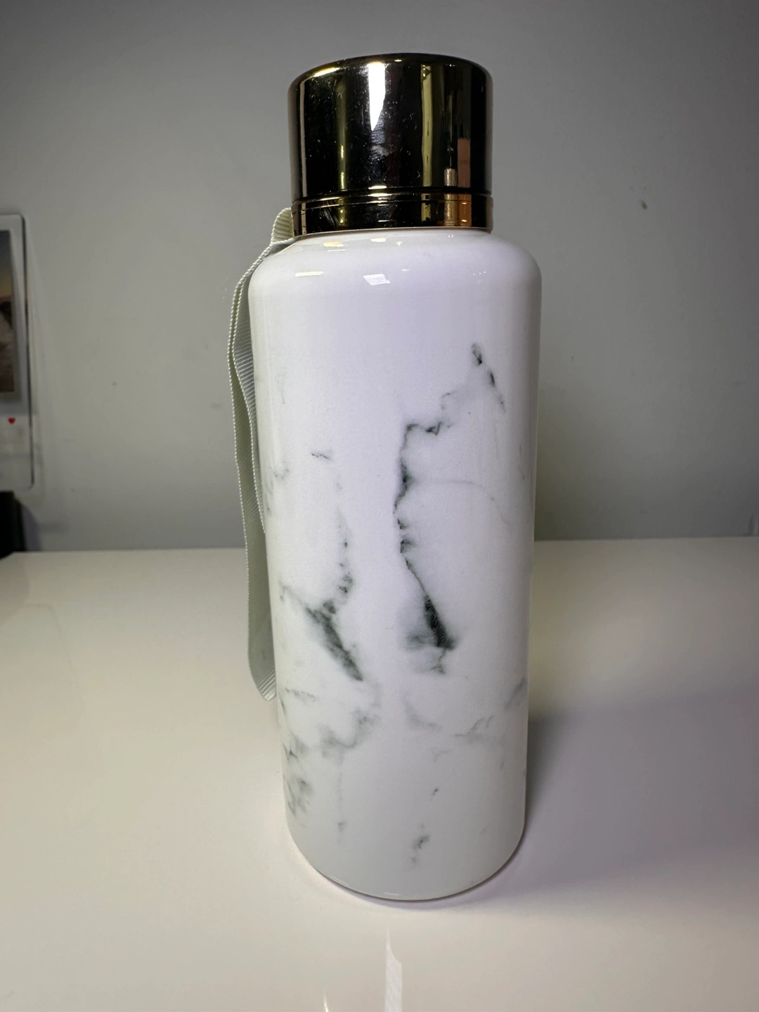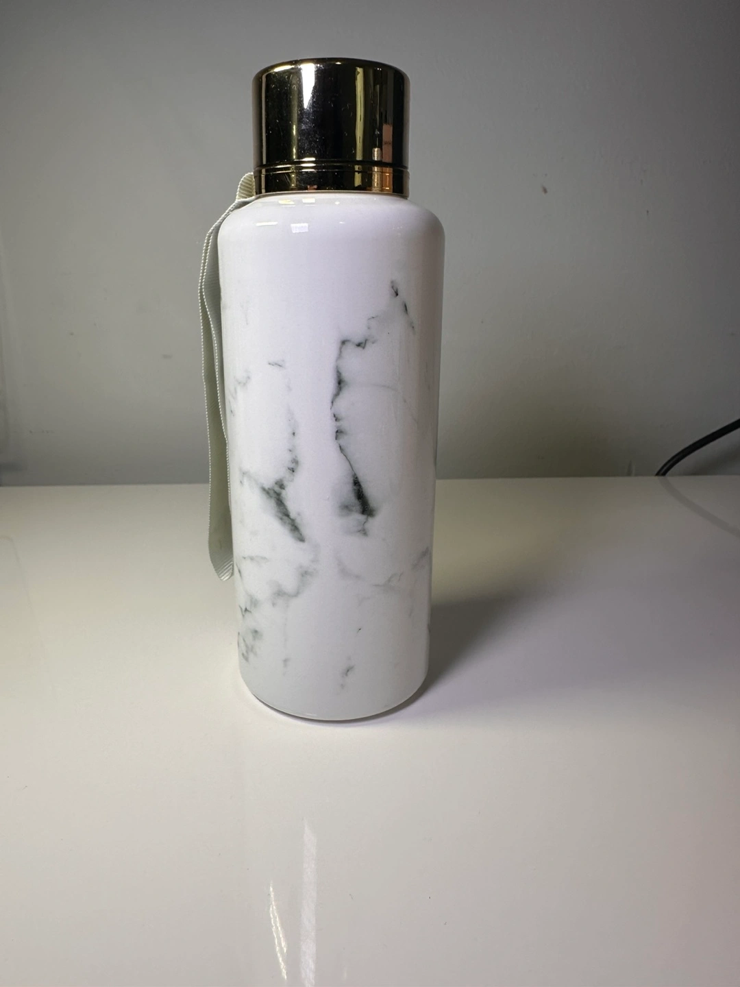 Plastic water bottle. Marble design. Gold-toned lid. Features a convenient carrying strap.