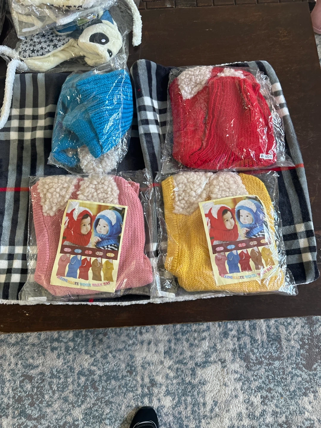 75I have some brand new winter warm hats available! They come in a variety of colours, including blue, red, pink, and yellow. They're still in their original packaging and ready to keep your little one cozy this winter