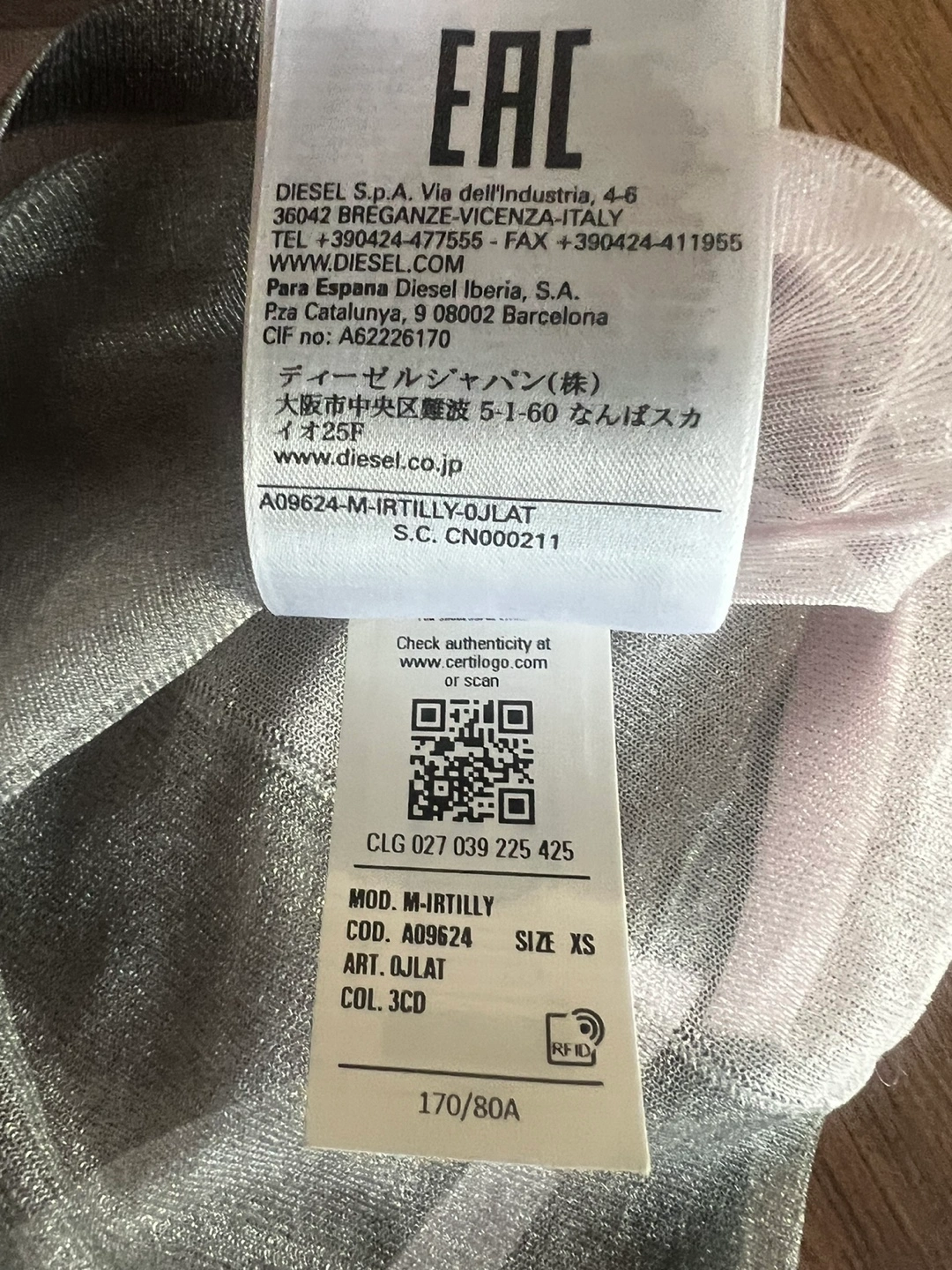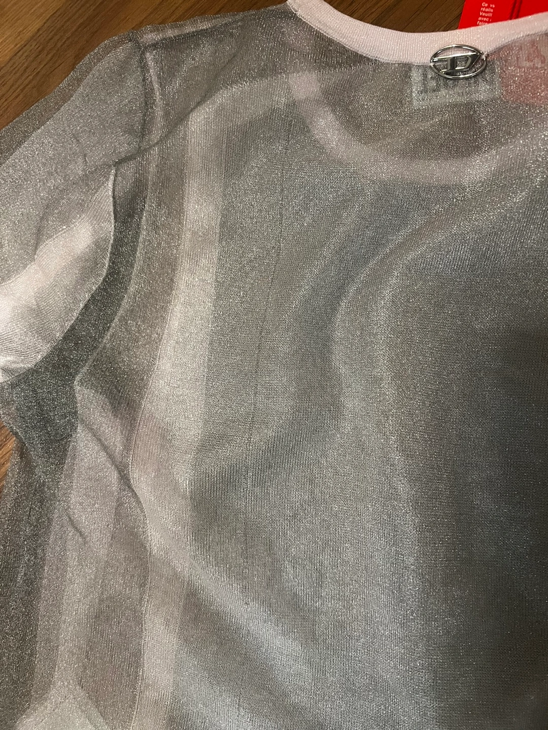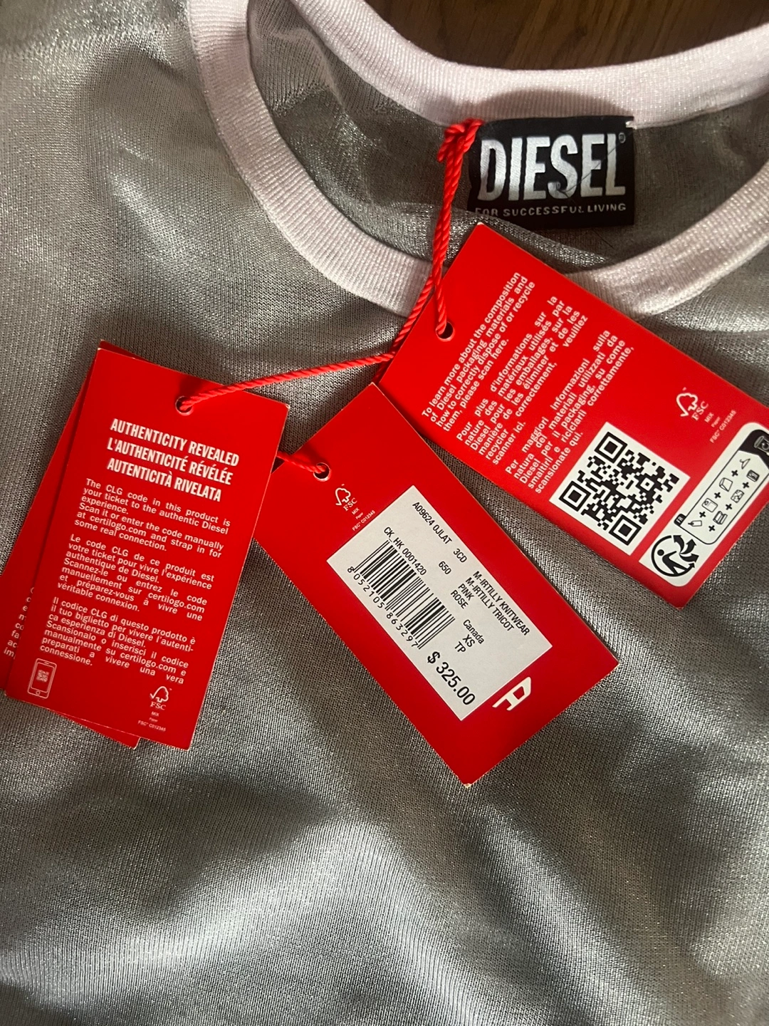 Brand new. Never worn. Rare diesel layered silver glitter long sleeve . Size XS. Can fit small Great gift idea 🎁 If ad is up that’s means it is available. 🙂 Pet free/smoke free home❌ Meet up at Yorkdale or area. I’m flexible 📍 Please see other listings for great deals and bundles. Fair negotiations always welcome Tags: Diesel, brand new, designer, silver sheer top, size XS-S top