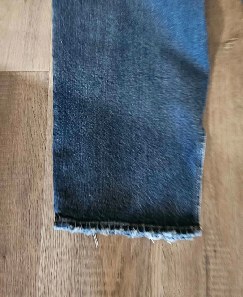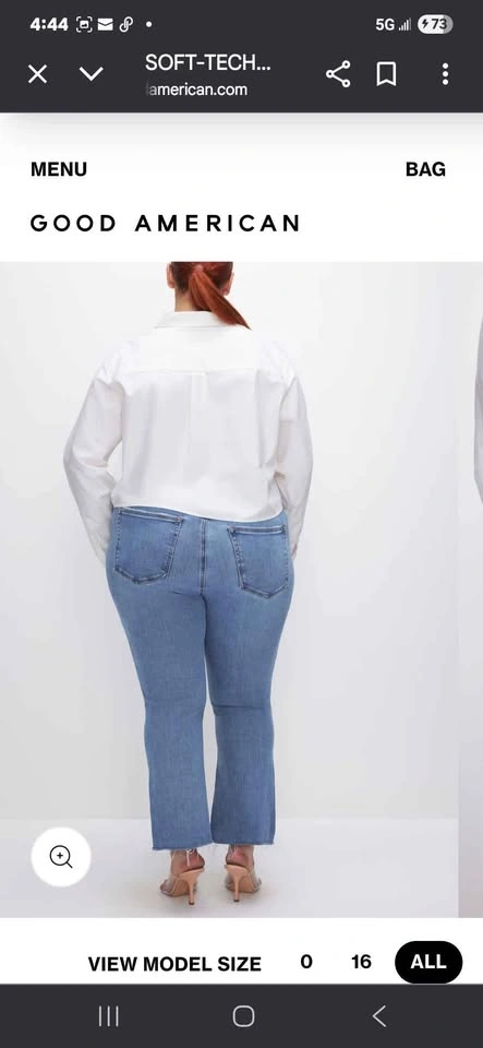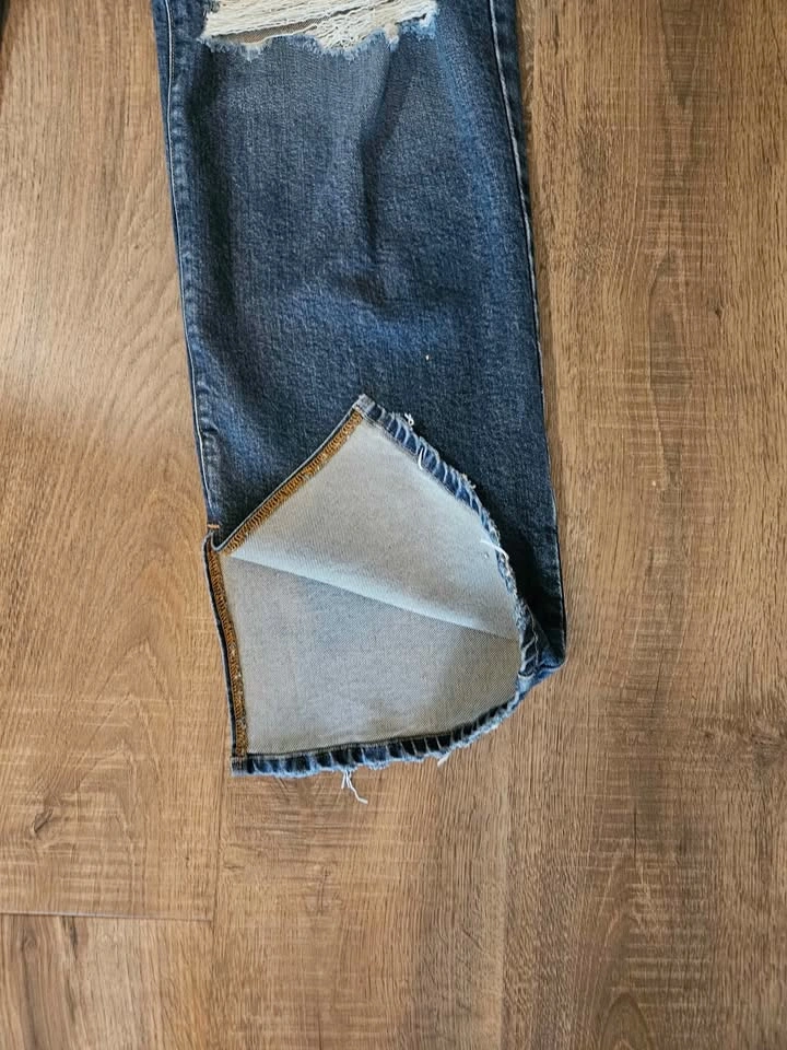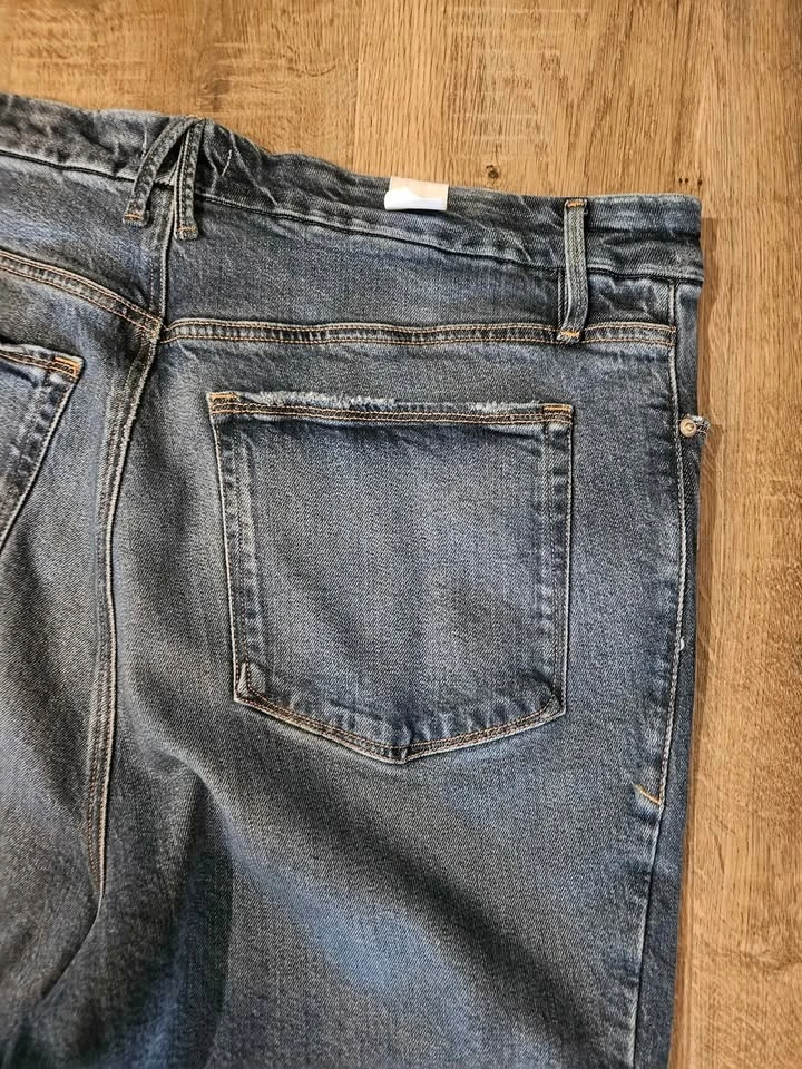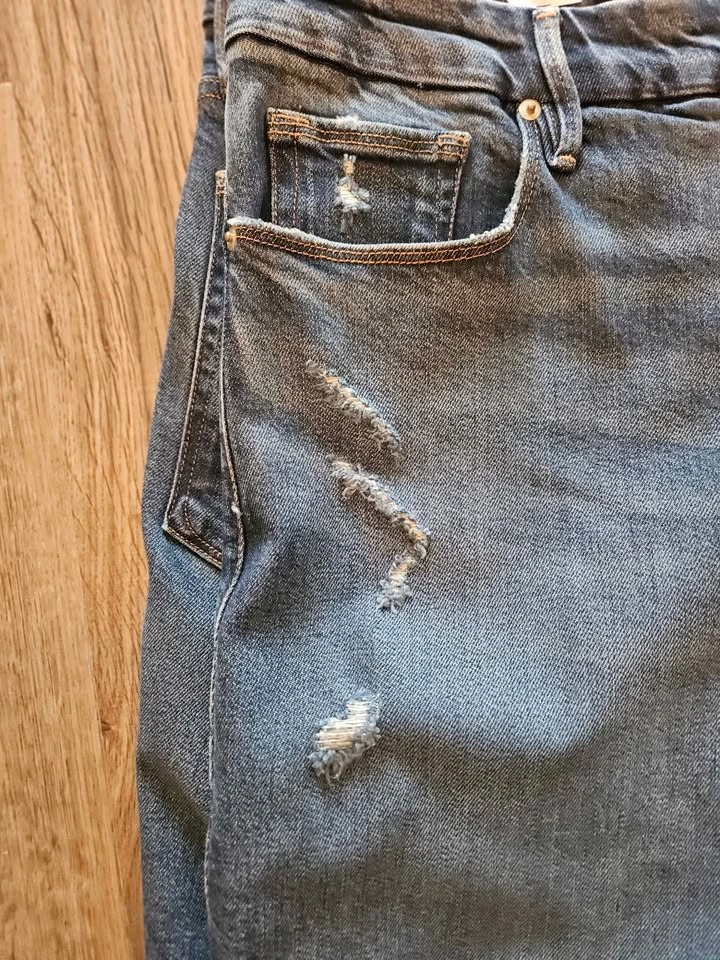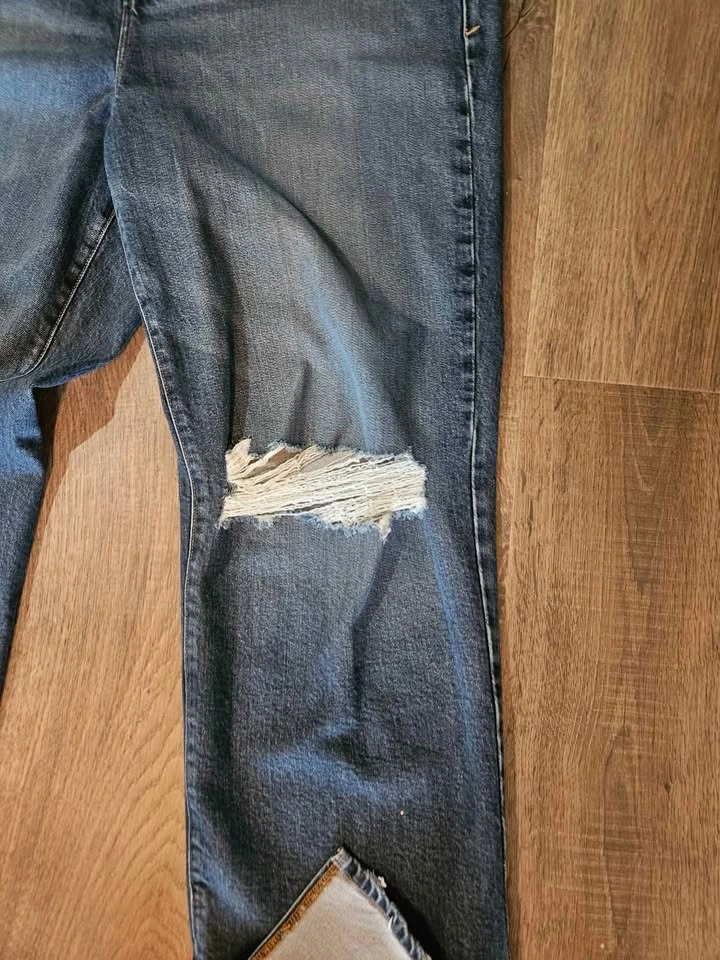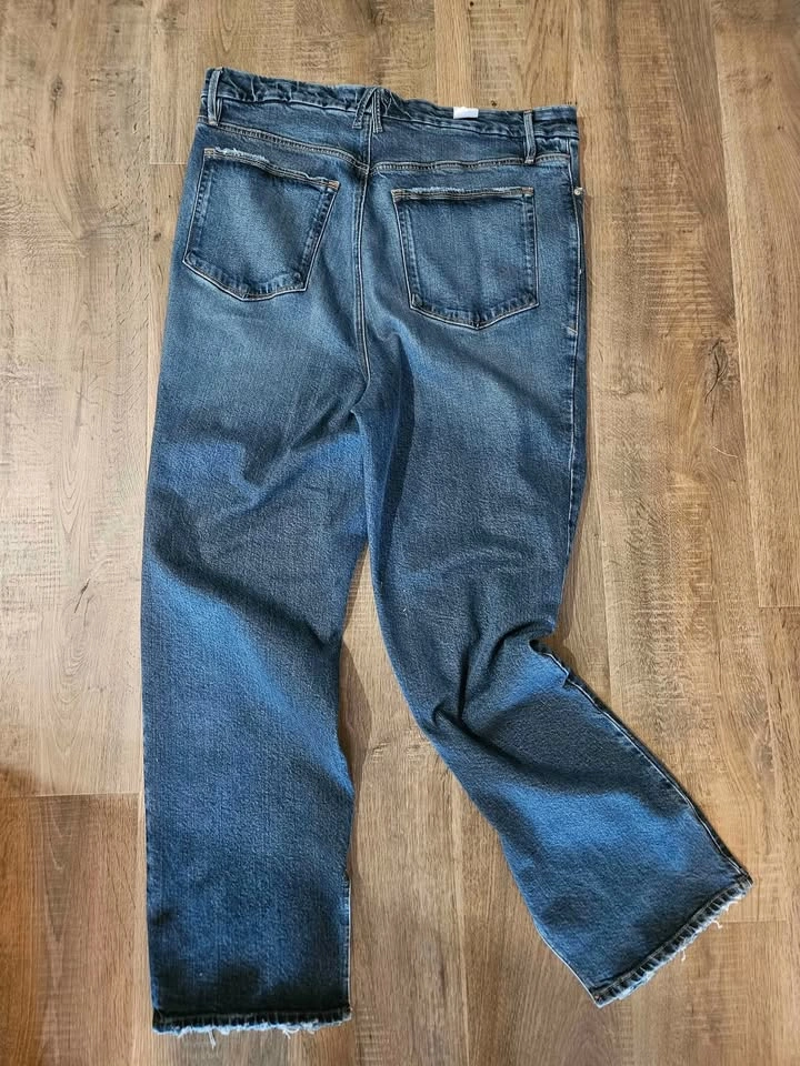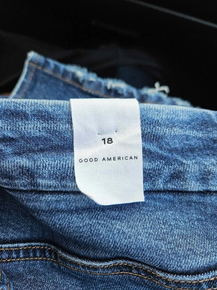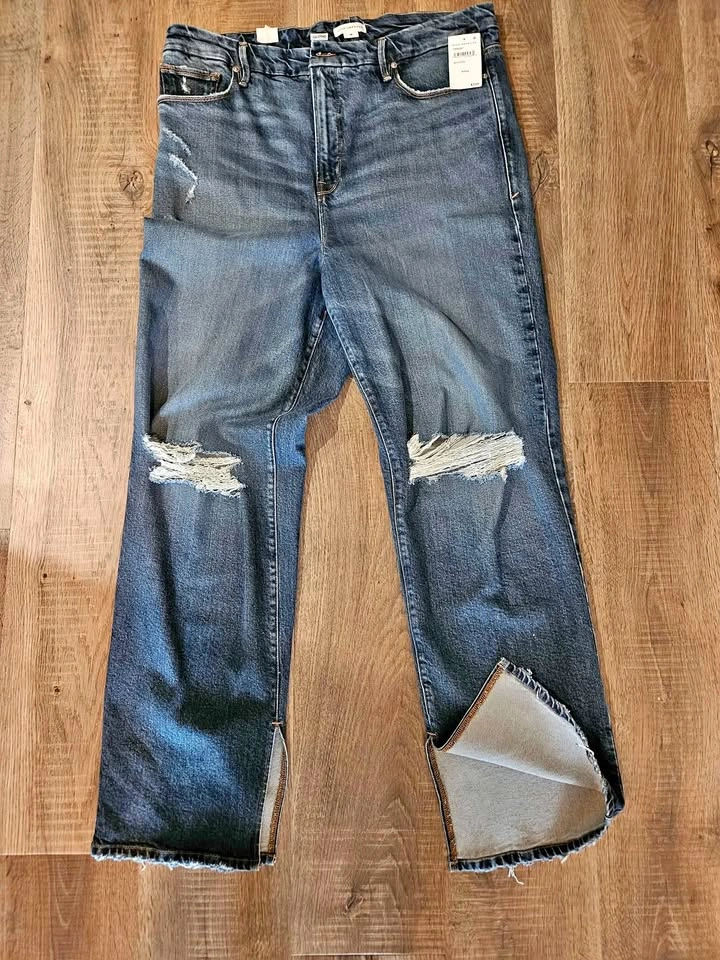 10New with Tags, "Good American" brand comfy soft stretch jeans. Distressed details on the pockets and hems with ripped knees for a trendy look. Perfect for everyday wear. Cute 6 1/2" slits on the inside bottom legs. Loose fit. 8 1/2" at the hem. Belt loops can accommodate up to a 2" belt. 32 1/2" inseam. Smoke-free home.