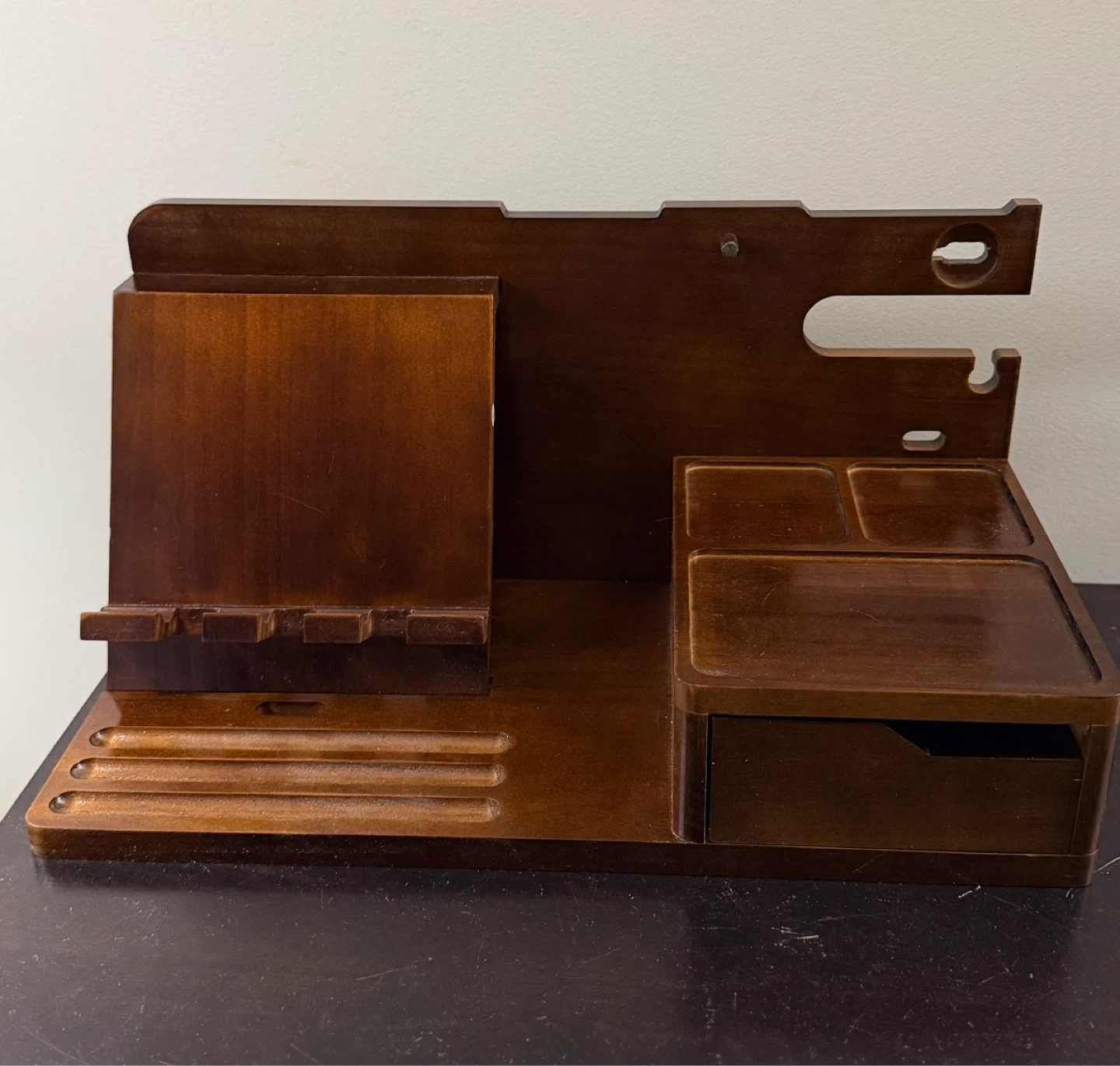 92Keep your desk tidy with this used wooden desk organizer! It's perfect for pens, phones, and other small items. The organizer features multiple compartments and a small drawer. Here are some of its features: * Multiple compartments * Small drawer * Solid wood construction This handy organizer is available, ready to bring order to your workspace. Don't miss out – if you're seeing this ad, it's still up for grabs!