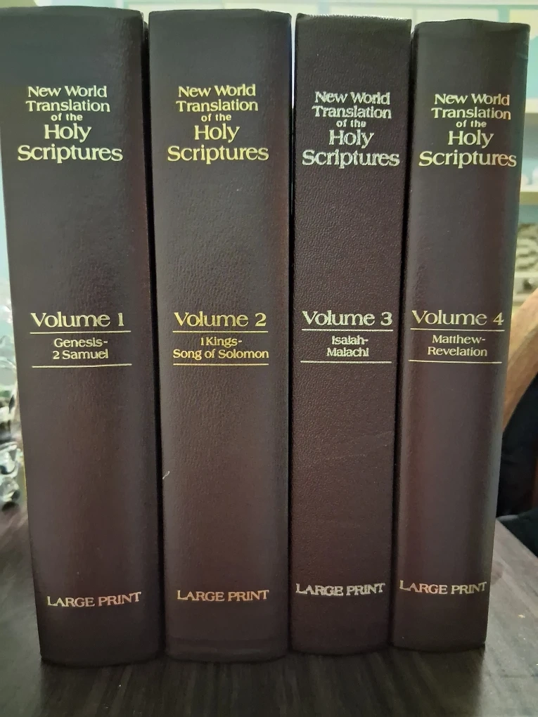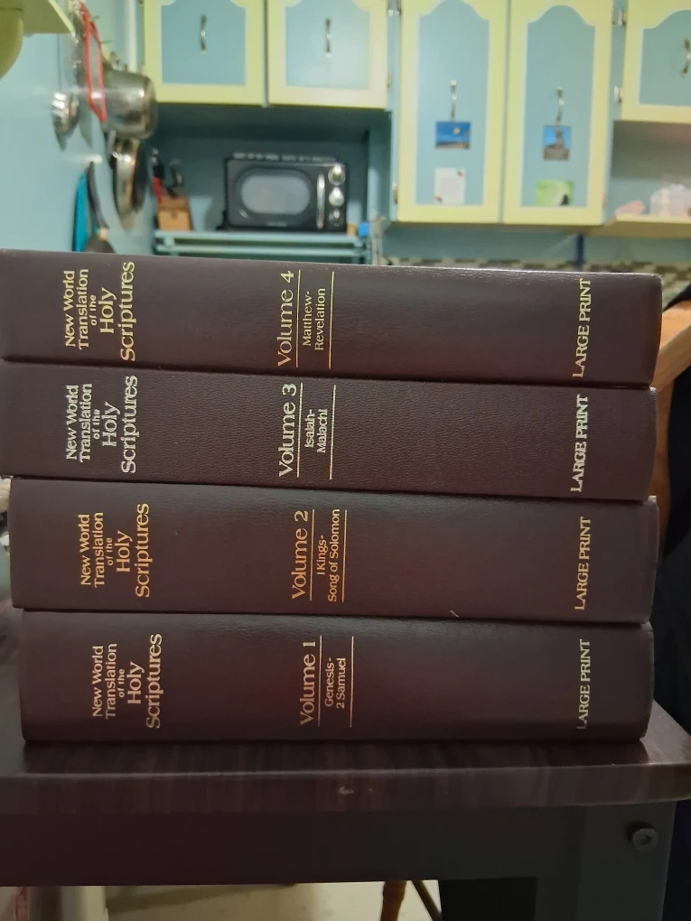 570Selling a set of four books: New World Translation of the Holy Scriptures. These are large print editions and include: - Volume 1: Genesis - 2 Samuel - Volume 2: 1 Kings - Song of Solomon - Volume 3: Isaiah - Malachi - Volume 4: Matthew - Revelation