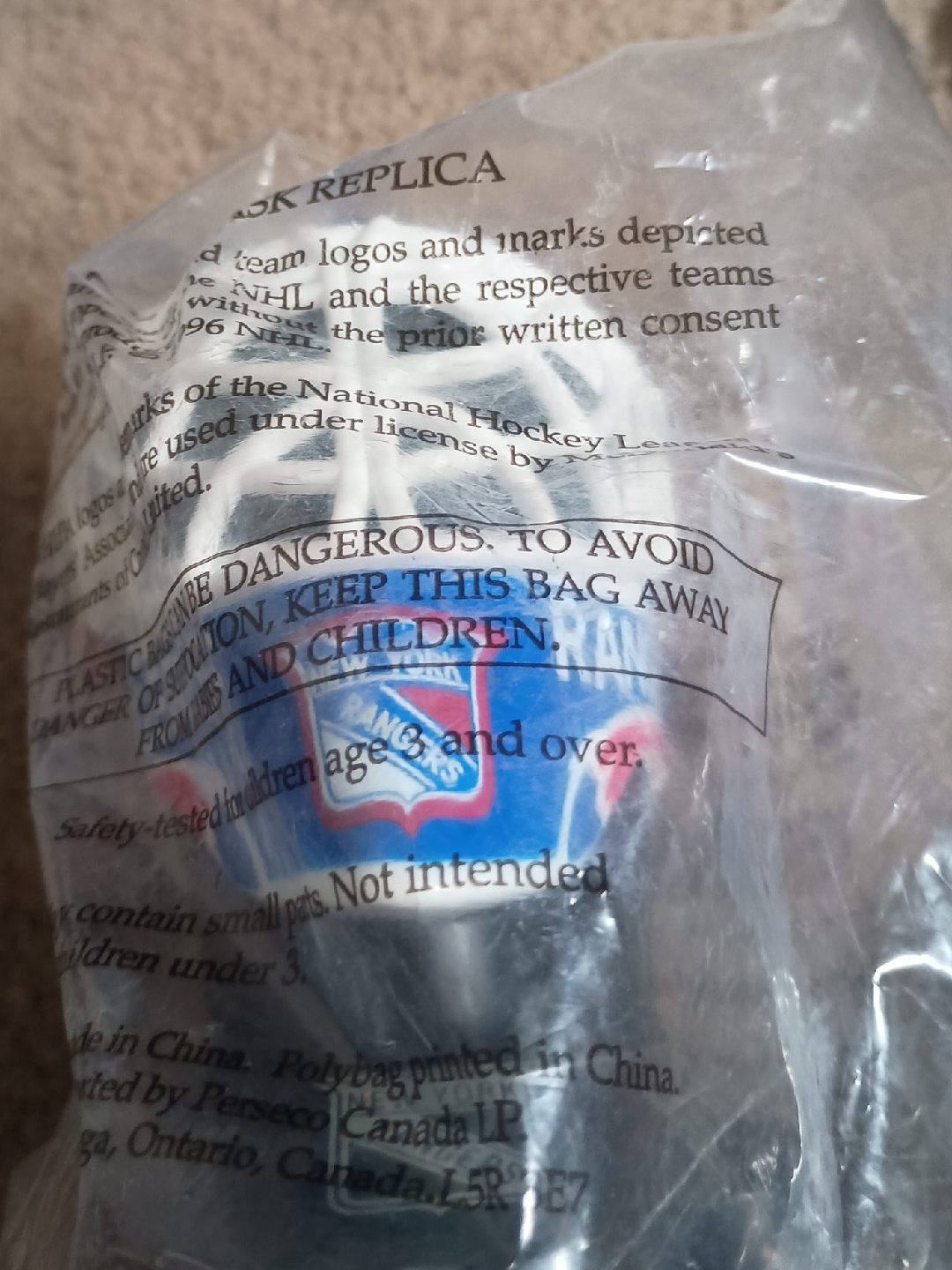 Selling a New York Rangers replica mini hockey helmet. Safety-tested for children age 3 and over. The polybag is printed in China and distributed by Perseco Canada LP.