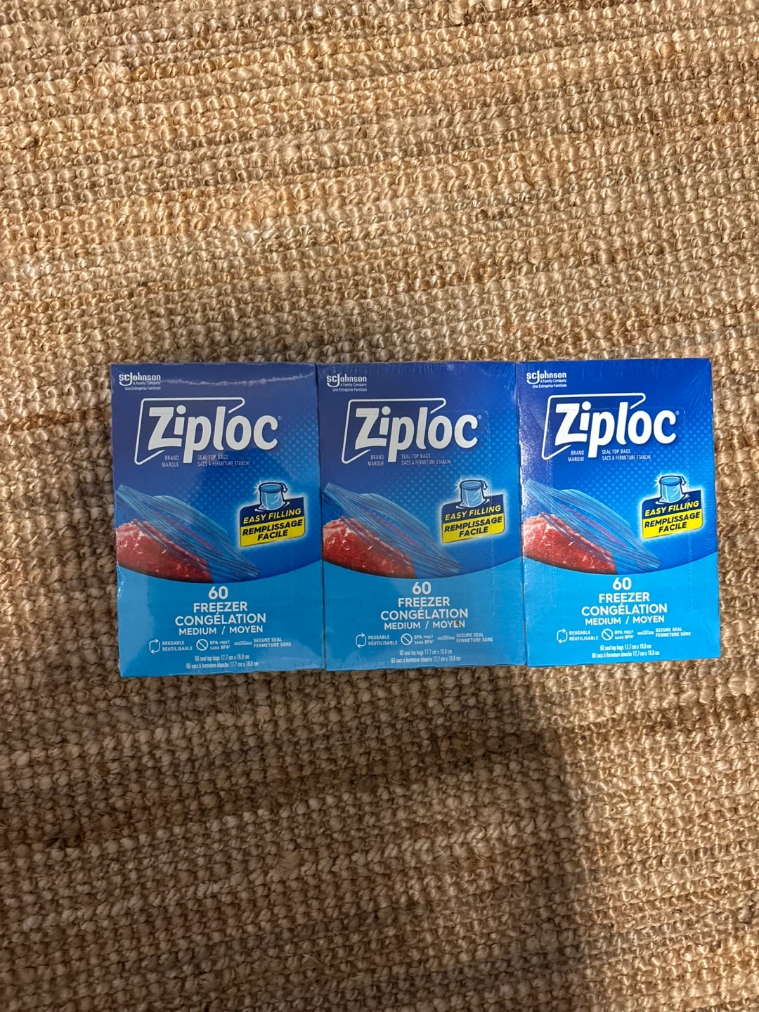 Selling new three boxes of Ziploc freezer bags! Each box contains 60 medium-sized bags, perfect for all your freezing needs. They are easy-filling and reusable, making them a great choice for food storage