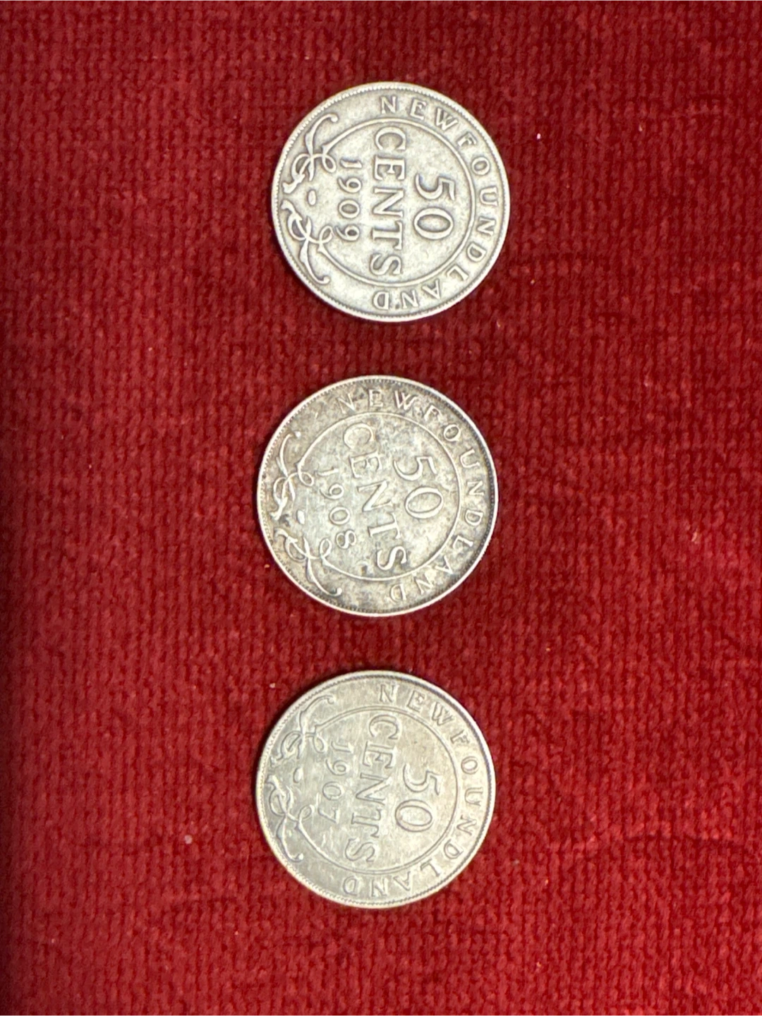995Newfoundland silver 50 cents are $40 each Selling three Newfoundland 50 cents coins. One is from 1907, one from 1908 and the last one from 1909. They show wear consistent with their age.