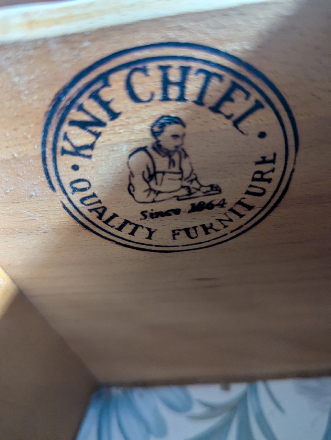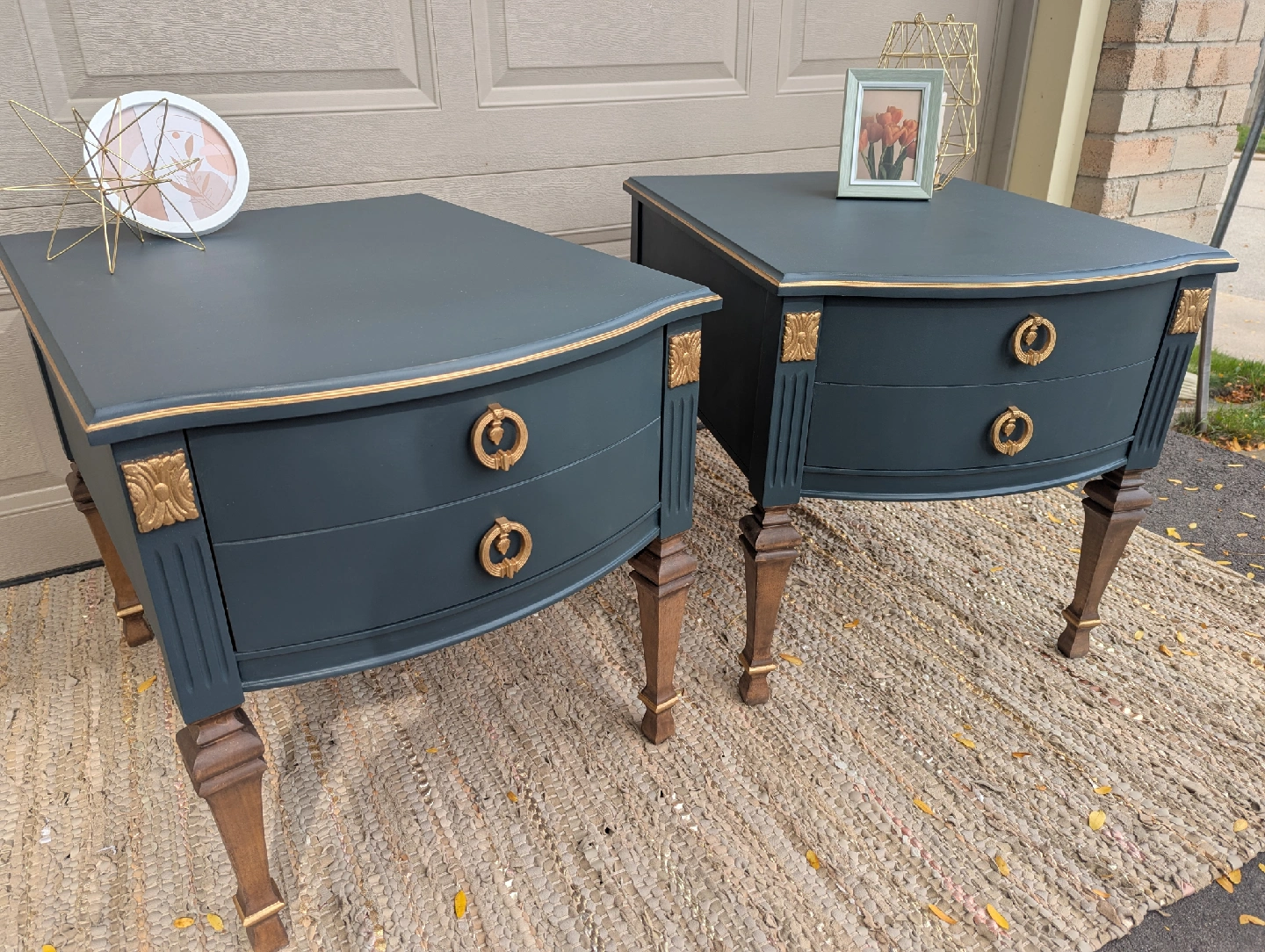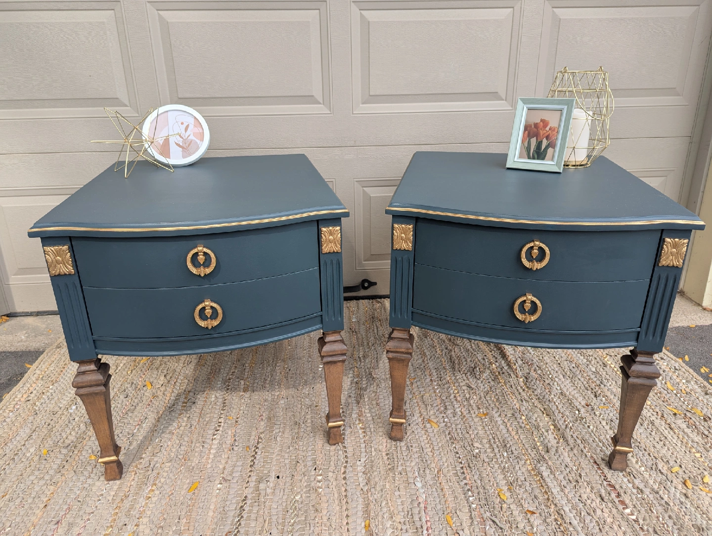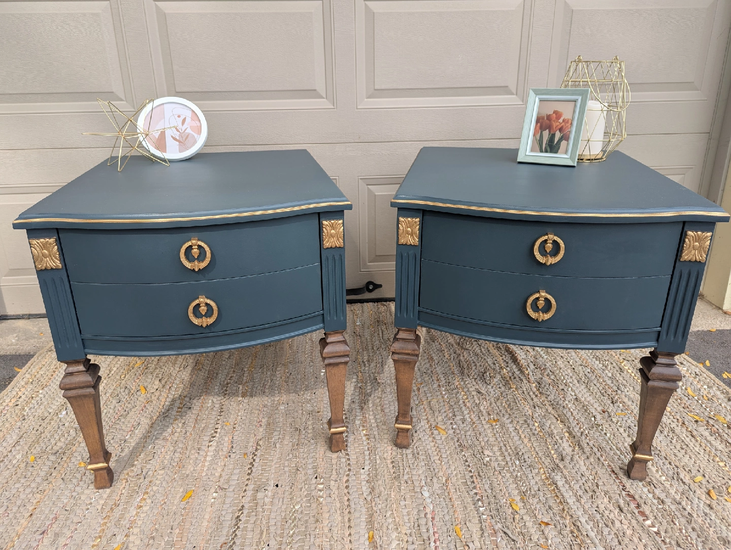 27Lx21Wx22H Newly refinished solid wood Knetchel side tables. Painted in a dark blue from Fusion Mineral with legs stained in a dark brown. Gilded details add a bit of glam to the pieces. Each table has one large drawer for plenty of storage. Drawers slide well. Pickup Fairview and Walkers, cash only.