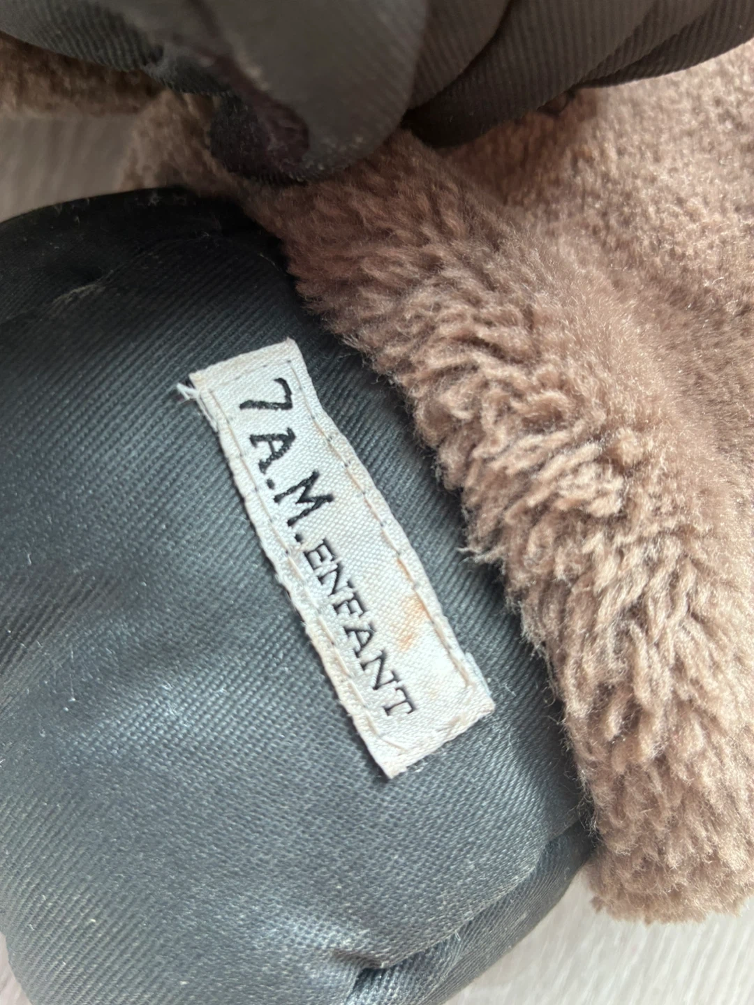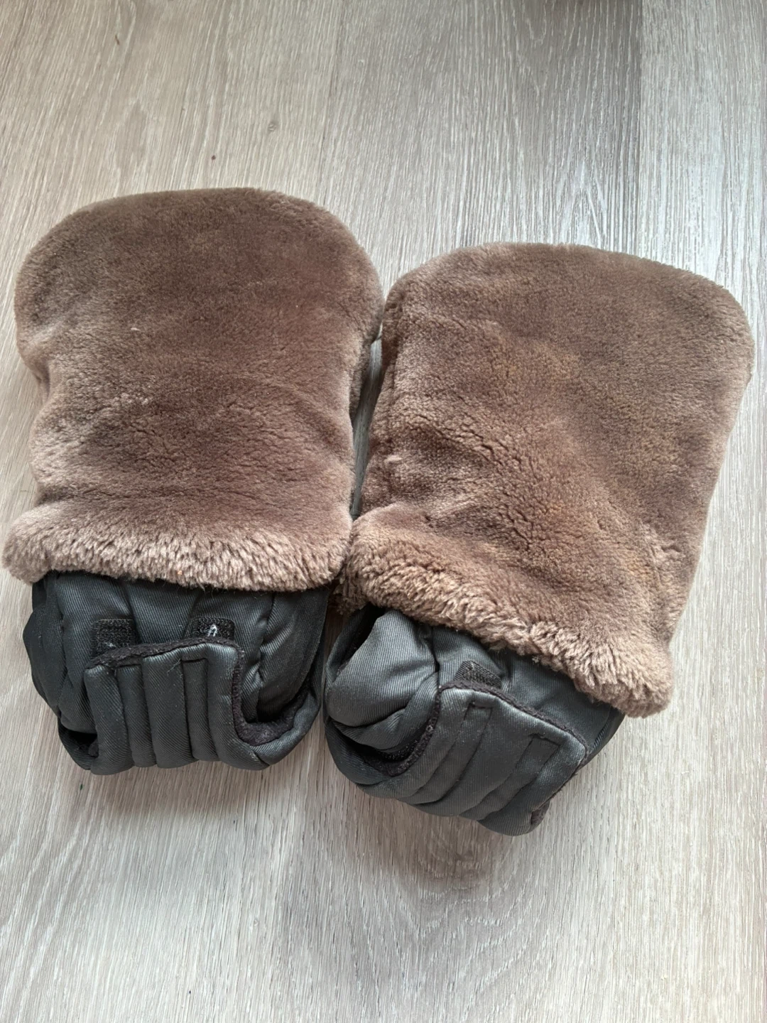 These are warm mittens from 7 A.M. Enfant. They're brown with a fuzzy lining and a black outer shell. These were key for me while pushing the stroller on chilly days !