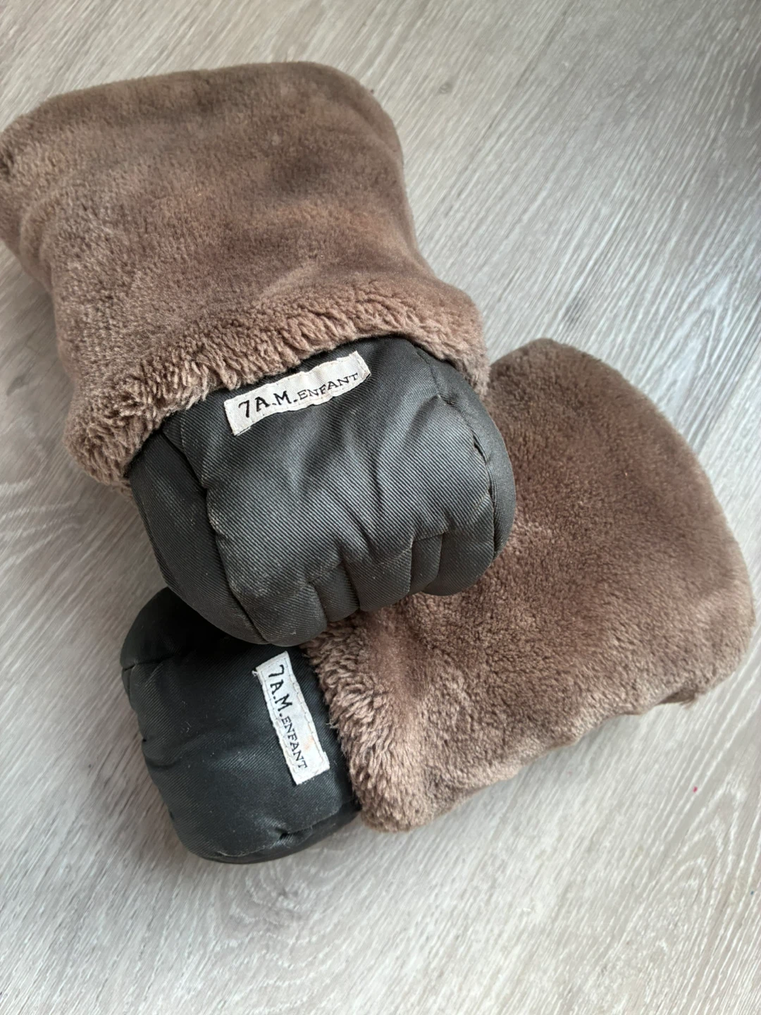 These are warm mittens from 7 A.M. Enfant. They're brown with a fuzzy lining and a black outer shell. These were key for me while pushing the stroller on chilly days !