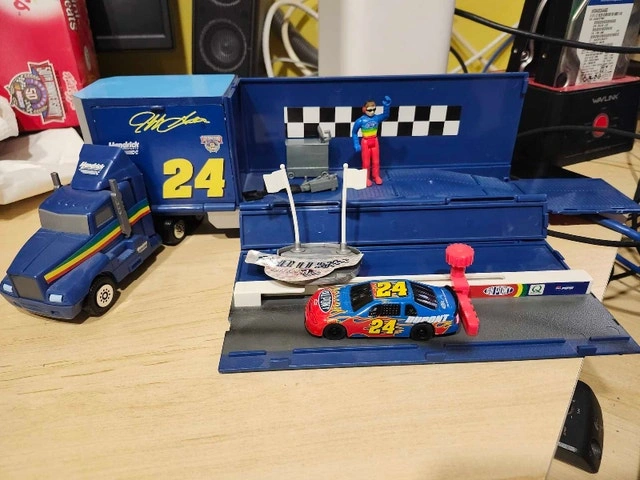 This used Jeff Gordon Winner's Circle transporter and car set features authentic detailing and is perfect for collectors and young racing enthusiasts alike. It includes a replica of Jeff Gordon's #24 race car and a matching transporter truck. This set is in used condition. Asking $30. Cash accepted.