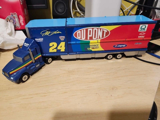 This used Jeff Gordon Winner's Circle transporter and car set features authentic detailing and is perfect for collectors and young racing enthusiasts alike. It includes a replica of Jeff Gordon's #24 race car and a matching transporter truck. This set is in used condition. Asking $30. Cash accepted.