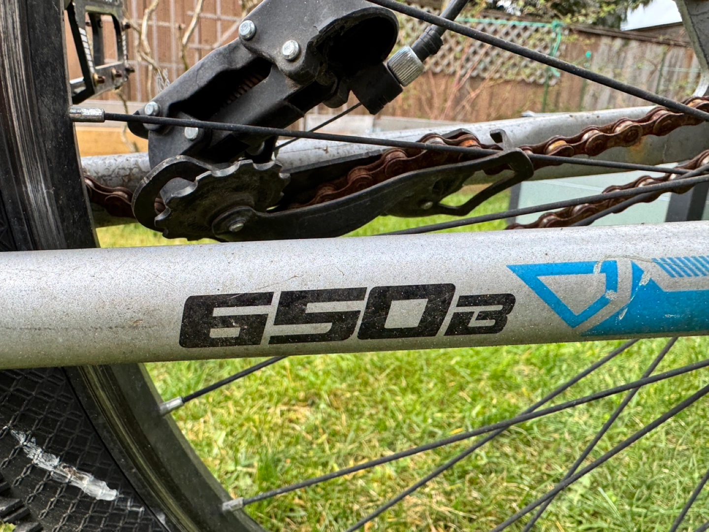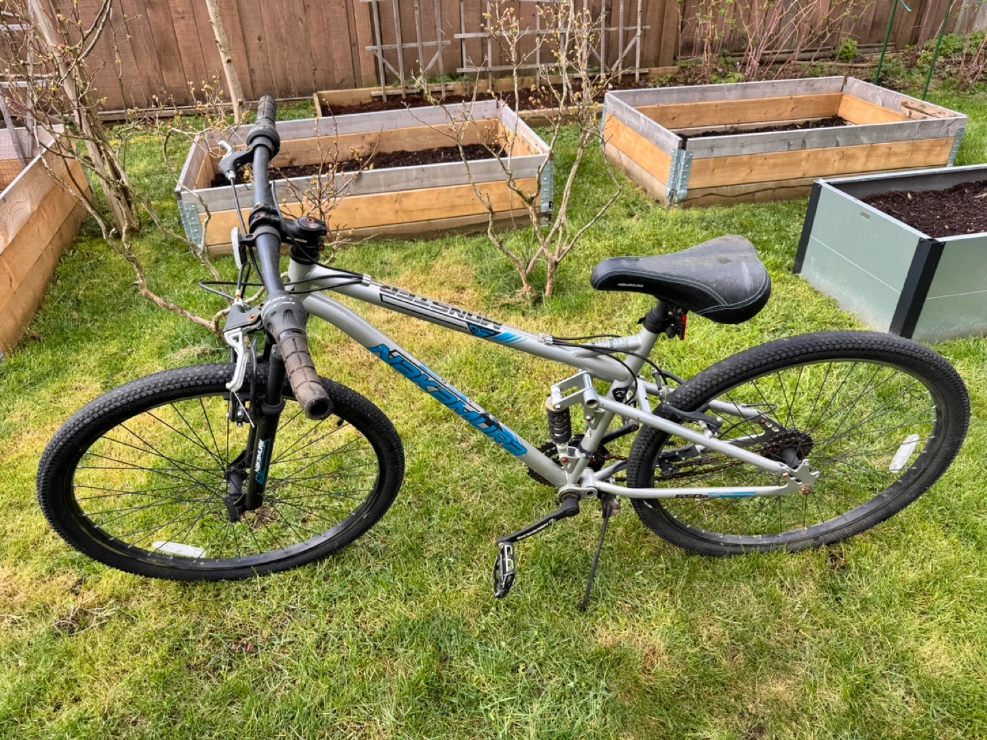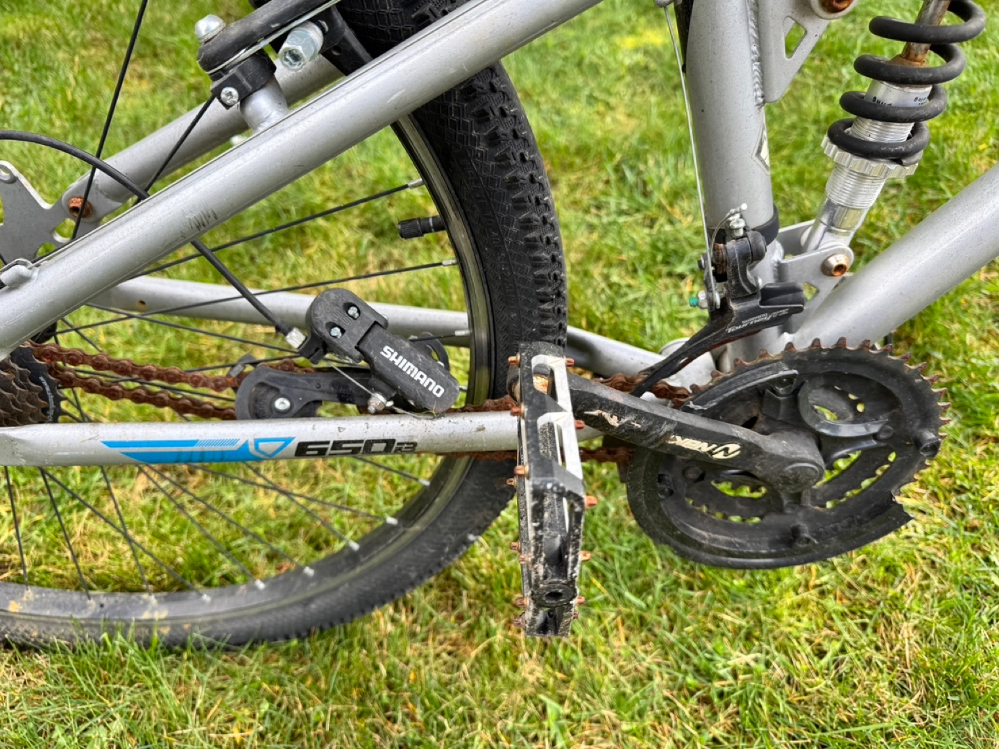 75Used Next mountain bike. Silver frame. Shimano parts. Full suspension. 26 inch wheels. Damaged in an accident last year and has been in my shed. Needs repairs to brakes and shifters. Free!