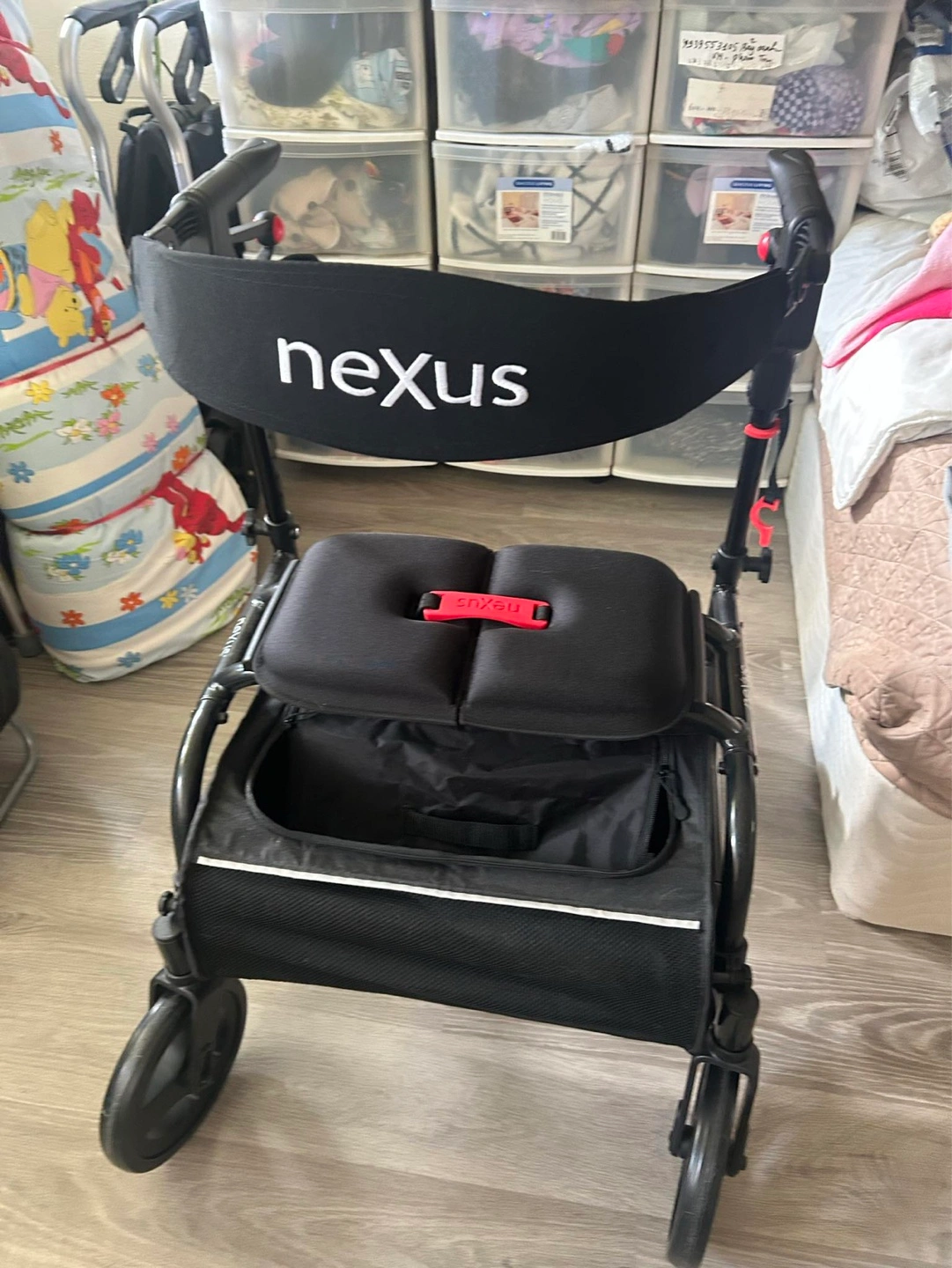 Black rollator walker. Features a padded seat, storage basket, and back support. Great for mobility and support.