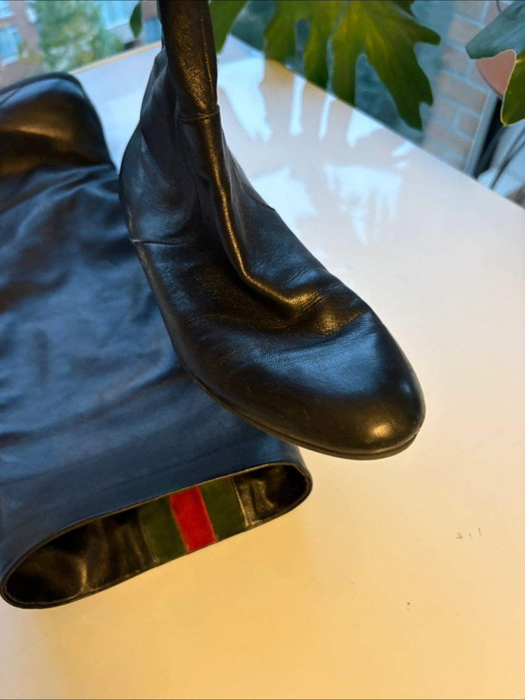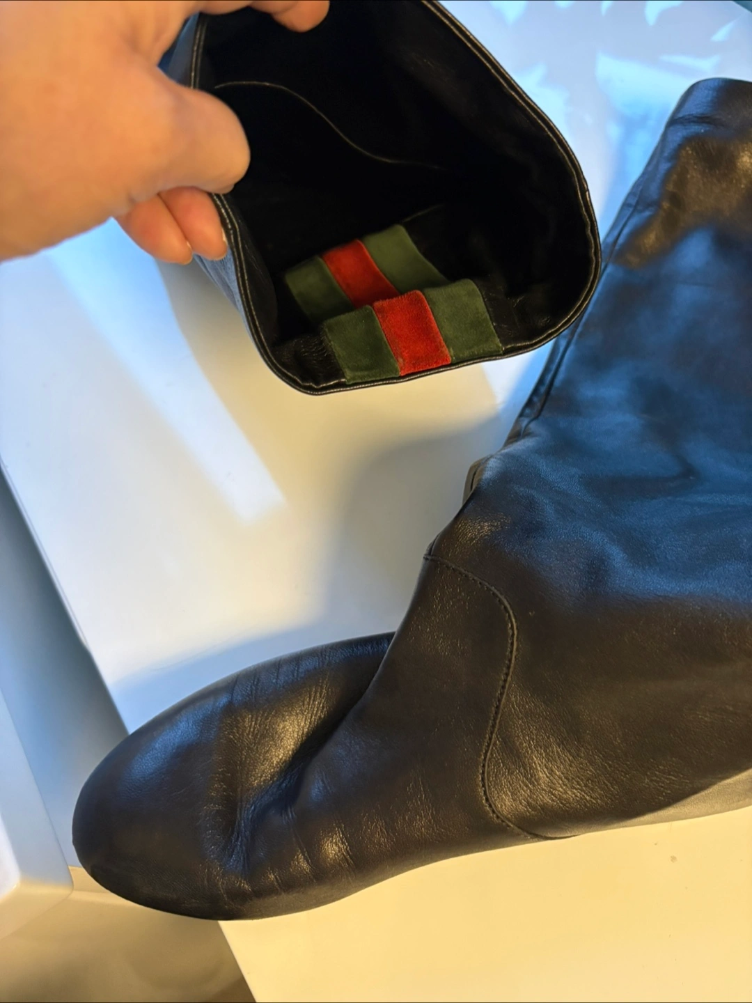 Selling a pair of Gucci black leather boots in size 36.5 They're in good condition and would be a great addition to your wardrobe original willing to part with them. Let me know if interested and will send a vid hard to take photo of such soft kid leather in immaculate condition .