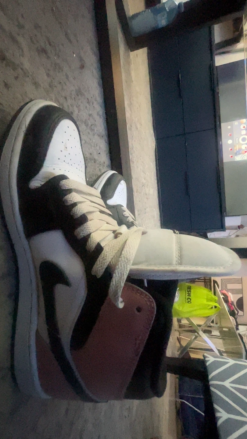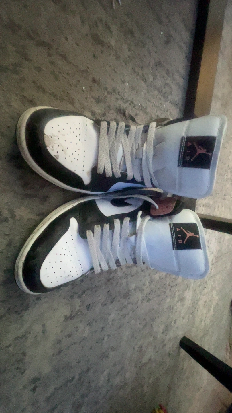 Classic Air Jordan 1 High sneakers in a black, white, and brown colourway. Leather and synthetic materials. Lace-up closure. Used 4 Times. Will clean the shoes when bought