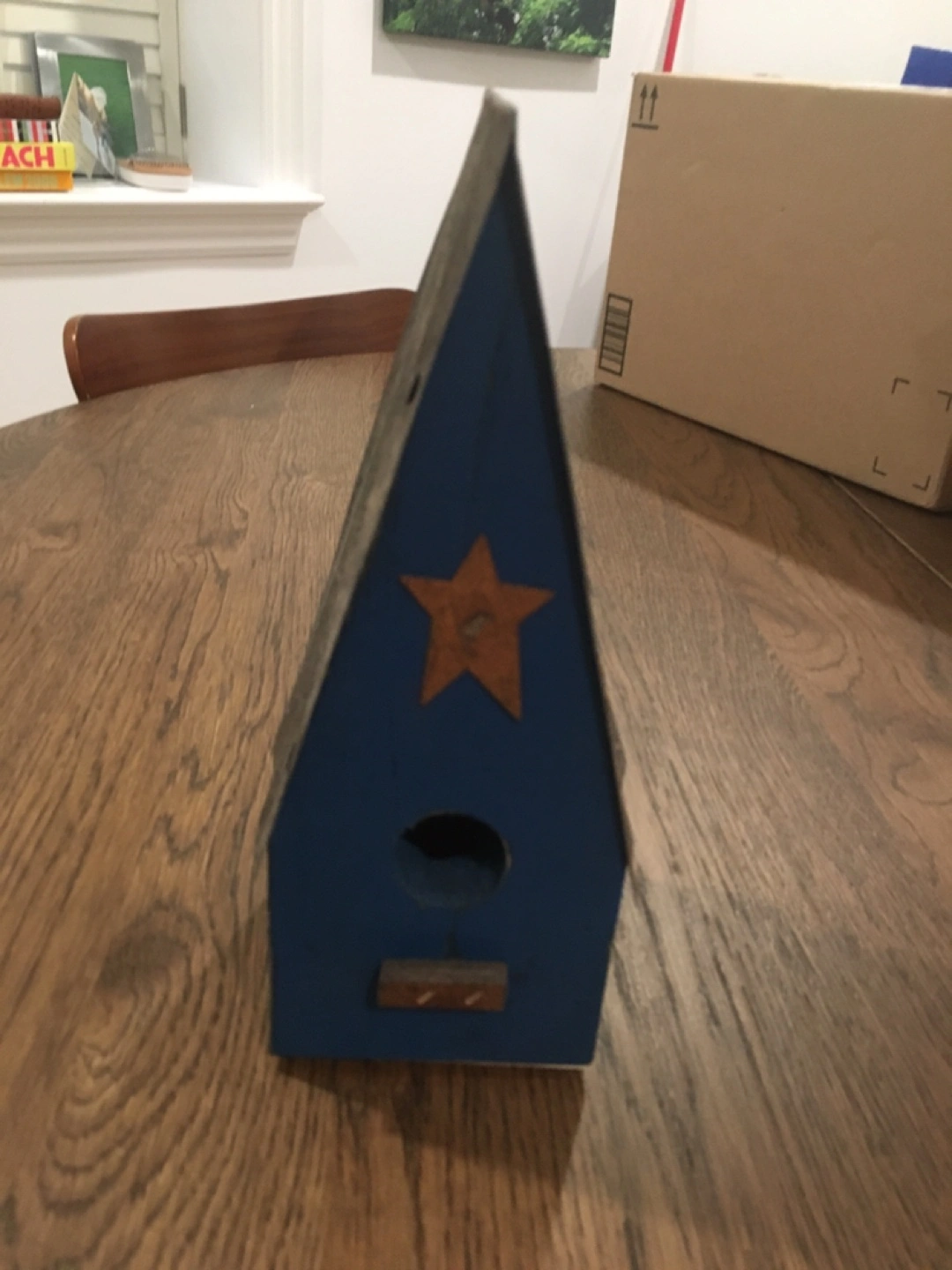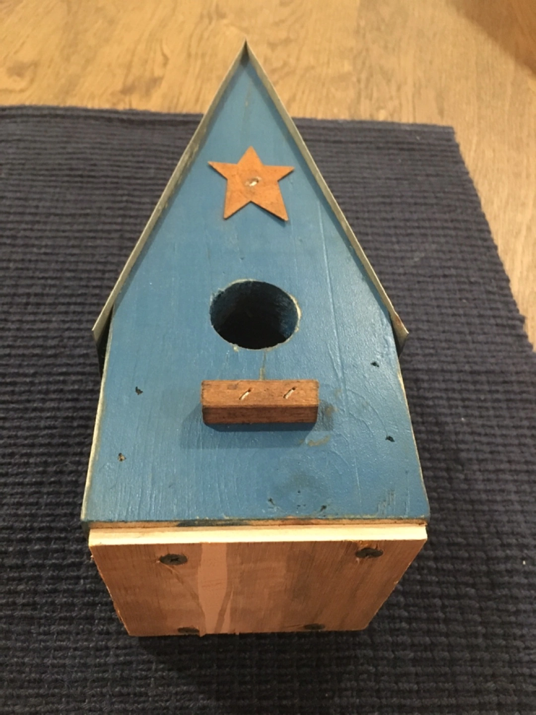 Rustic Wooden decorative birdhouse with a painted blue exterior and a star on the front. The roof has a weathered finish. The birdhouse sits on a square wooden base.