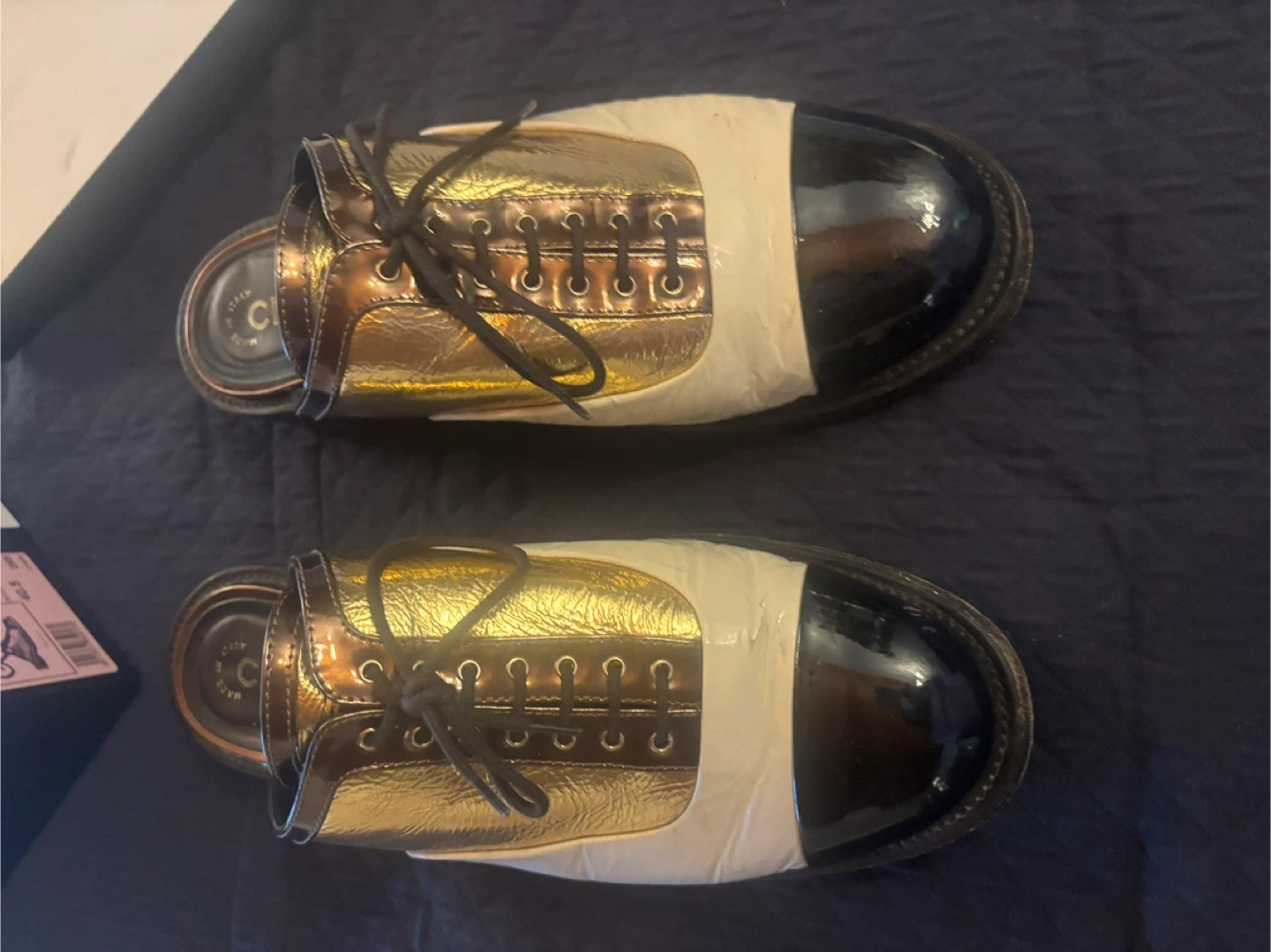 These are Chanel mule shoes in a gold, white, and black colourway. Made in Italy. Includes original box and dust bags. Size 40.5.