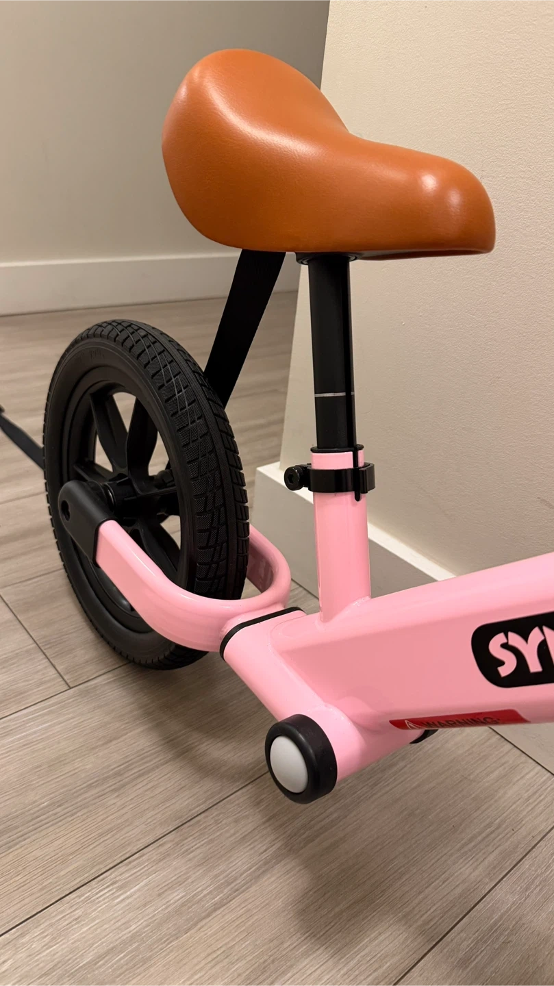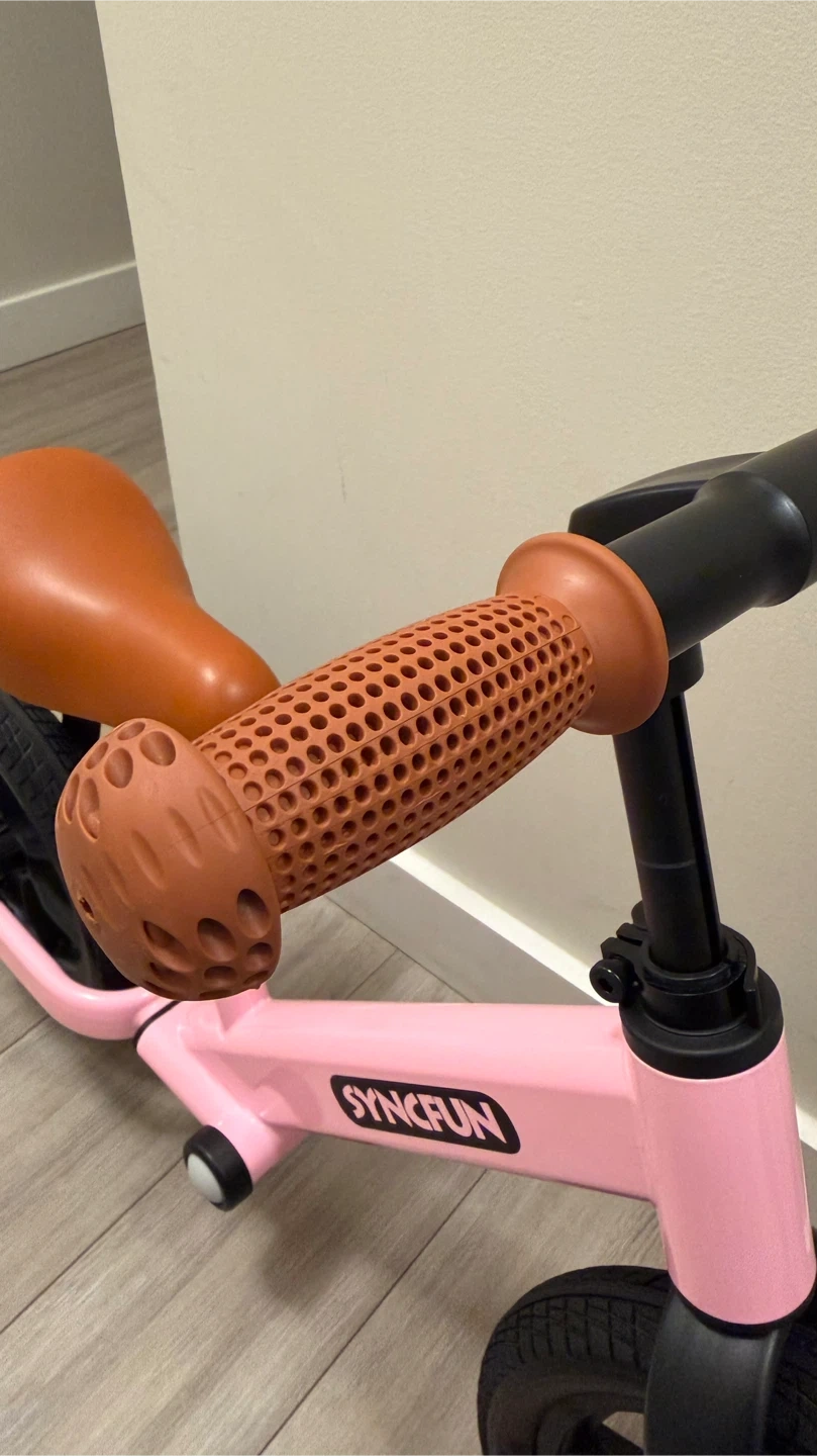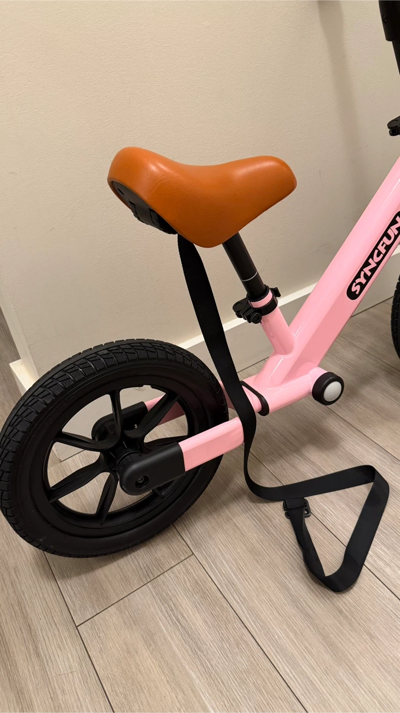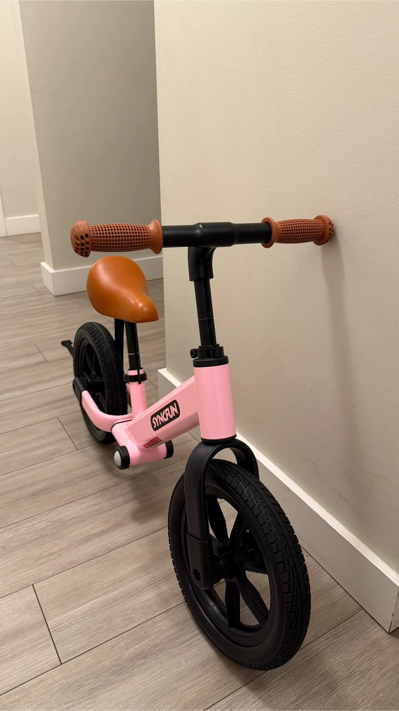 This is a pink SYNCFUN balance bike. It has a comfortable brown seat and textured grips. The bike has durable black wheels.