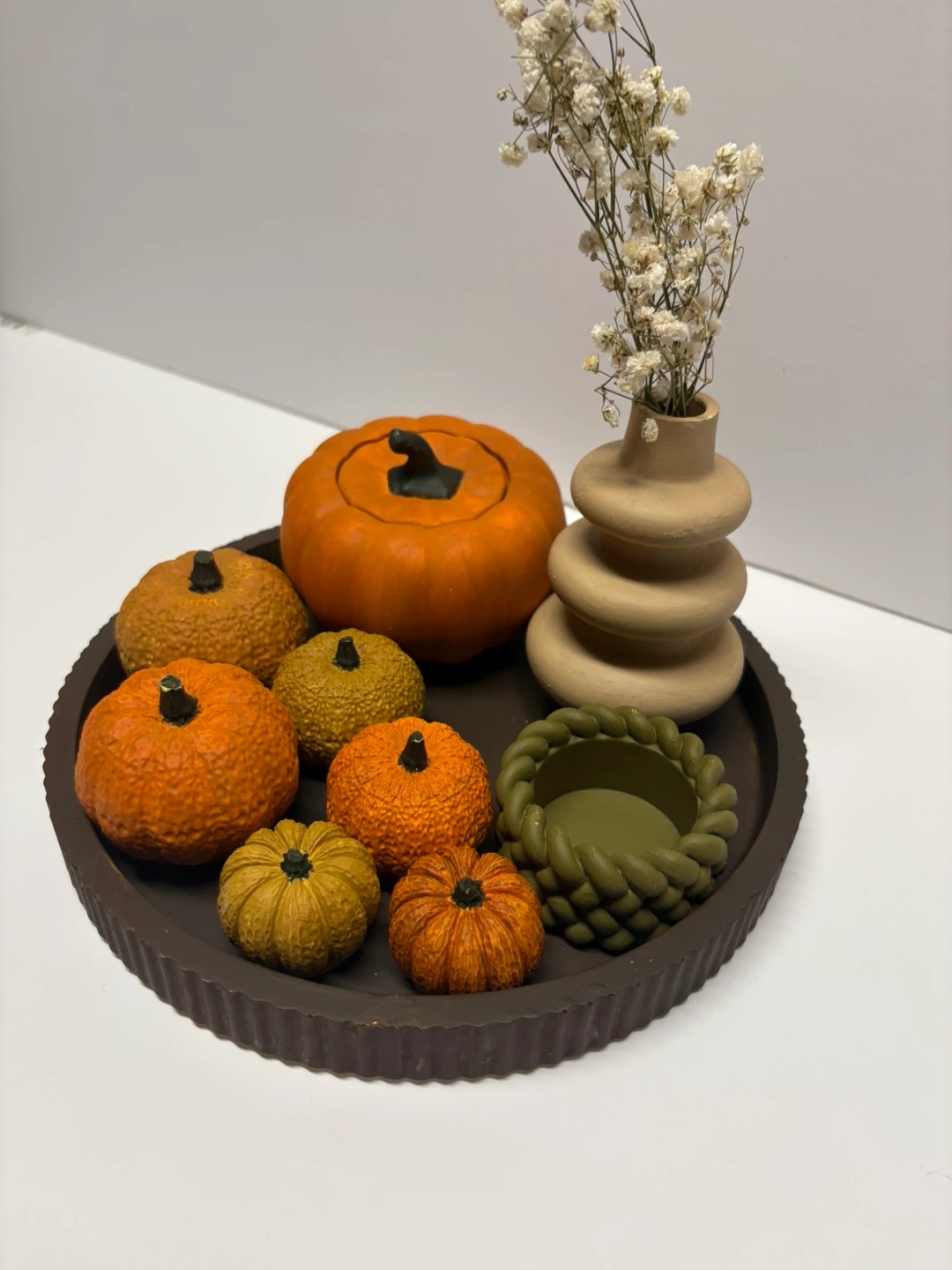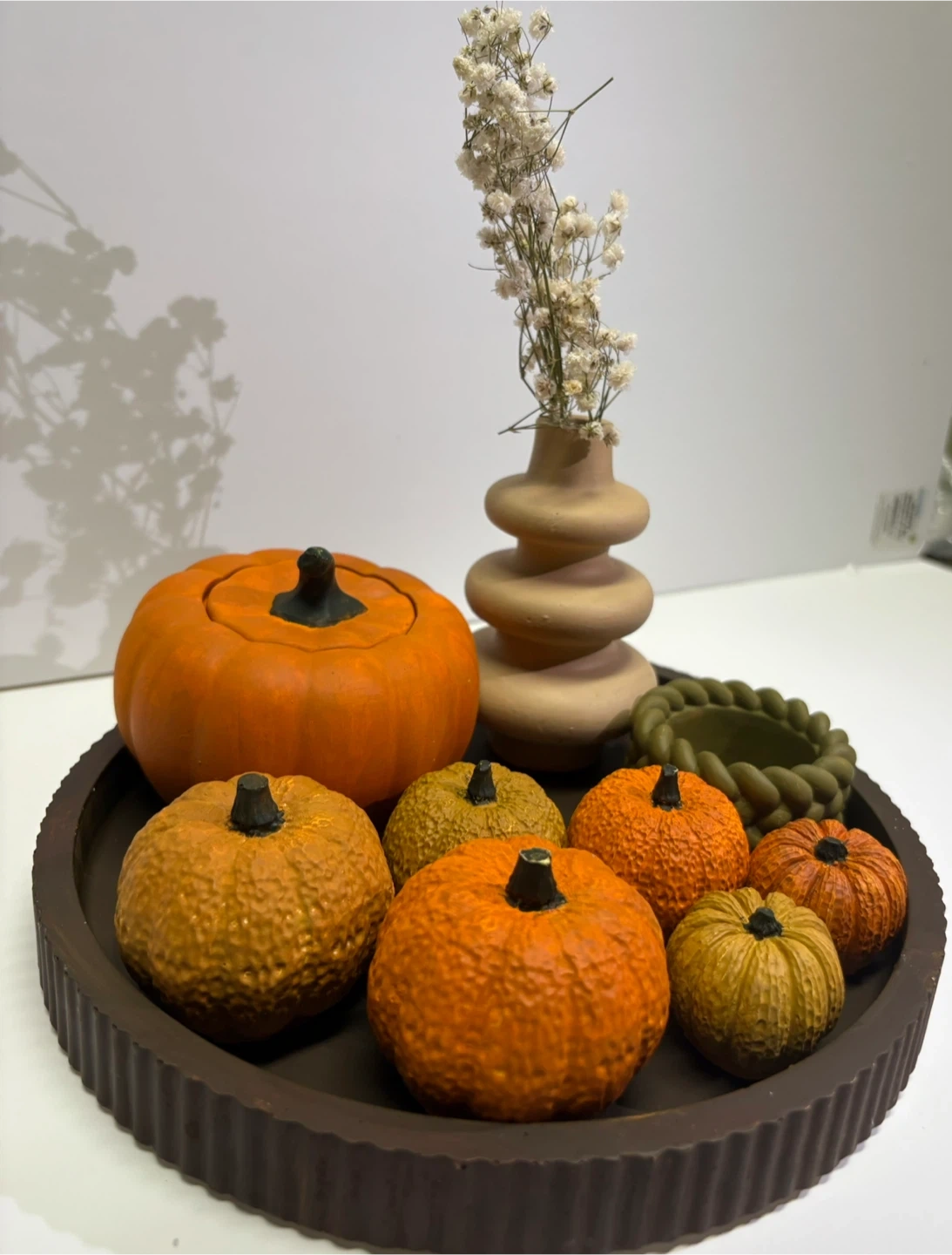 The large pumpkin acts as a stylish trinket jar, perfect for holding jewelry, candy, keys, or simply hiding clutter. The round tray is ideal for displaying candles, keys, or small essentials.