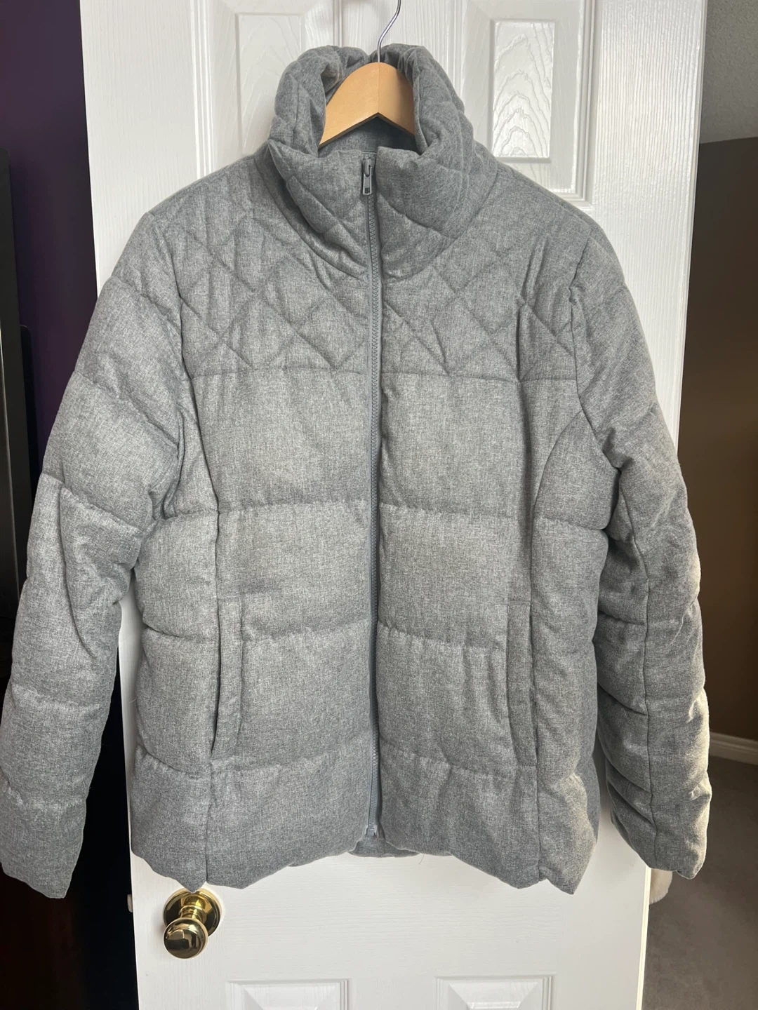 Cozy Old Navy puffer jacket in a heathered grey. It's a size large with a fleece-lined interior. Perfect for staying warm during colder weather!