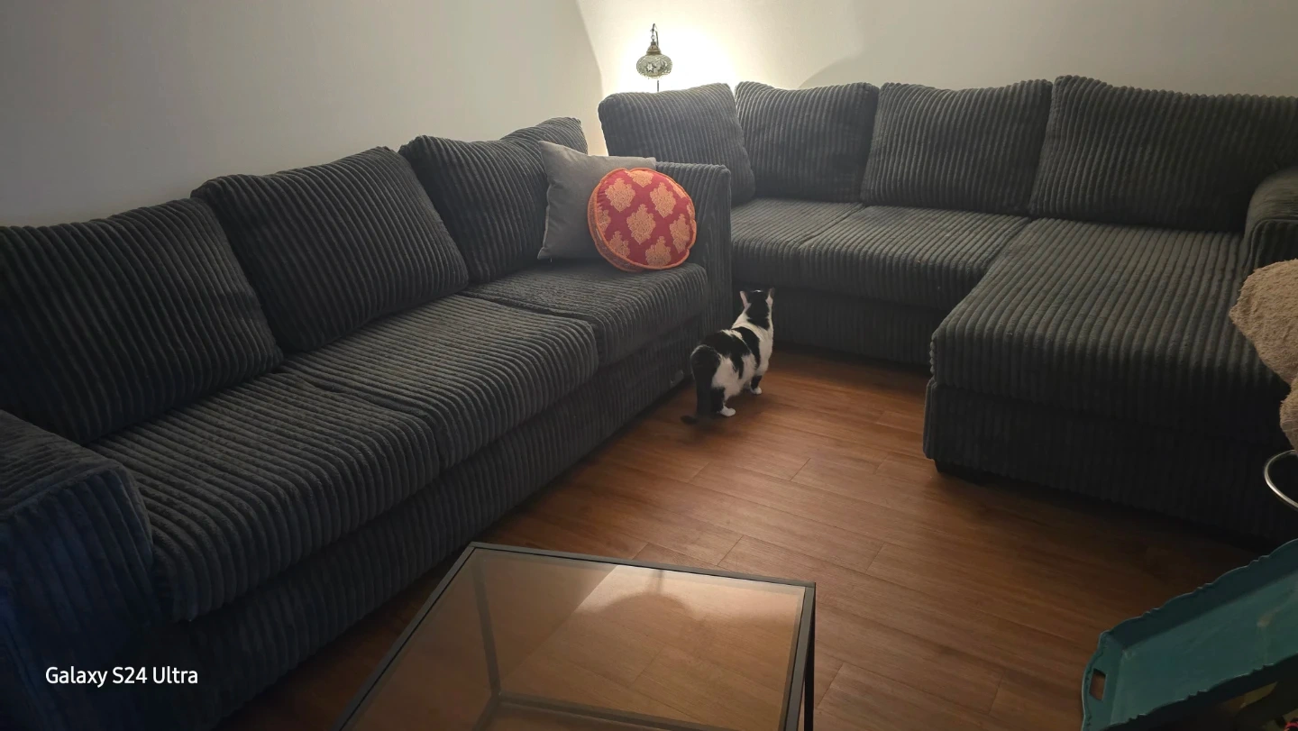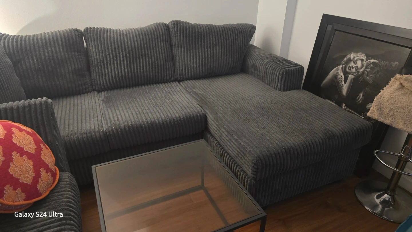 Comfy grey corduroy sectional sofa. It's soft and has deep seating. Perfect for a living room or rec room!