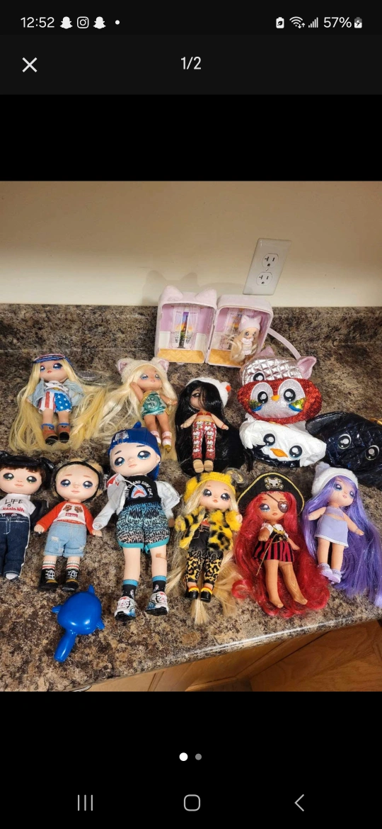 Twelve collectible dolls, various outfits and styles. Includes accessories like a small house and plushies. Great for collectors or imaginative play.