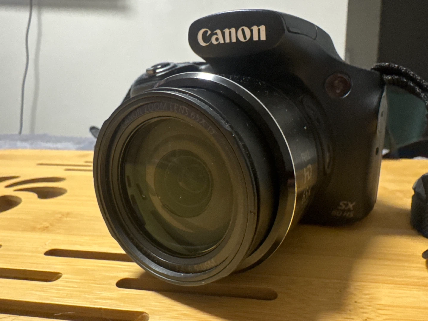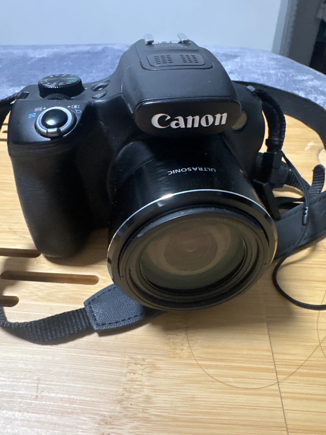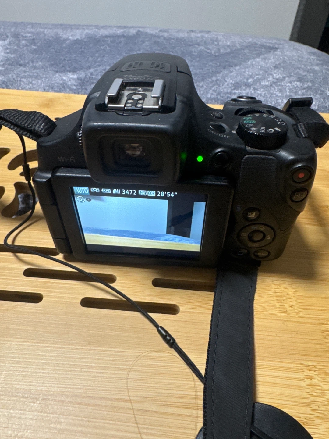Canon PowerShot SX60 HS digital camera with 65x optical zoom lens. Features Wi-Fi connectivity and Full HD video recording. Includes strap and battery.