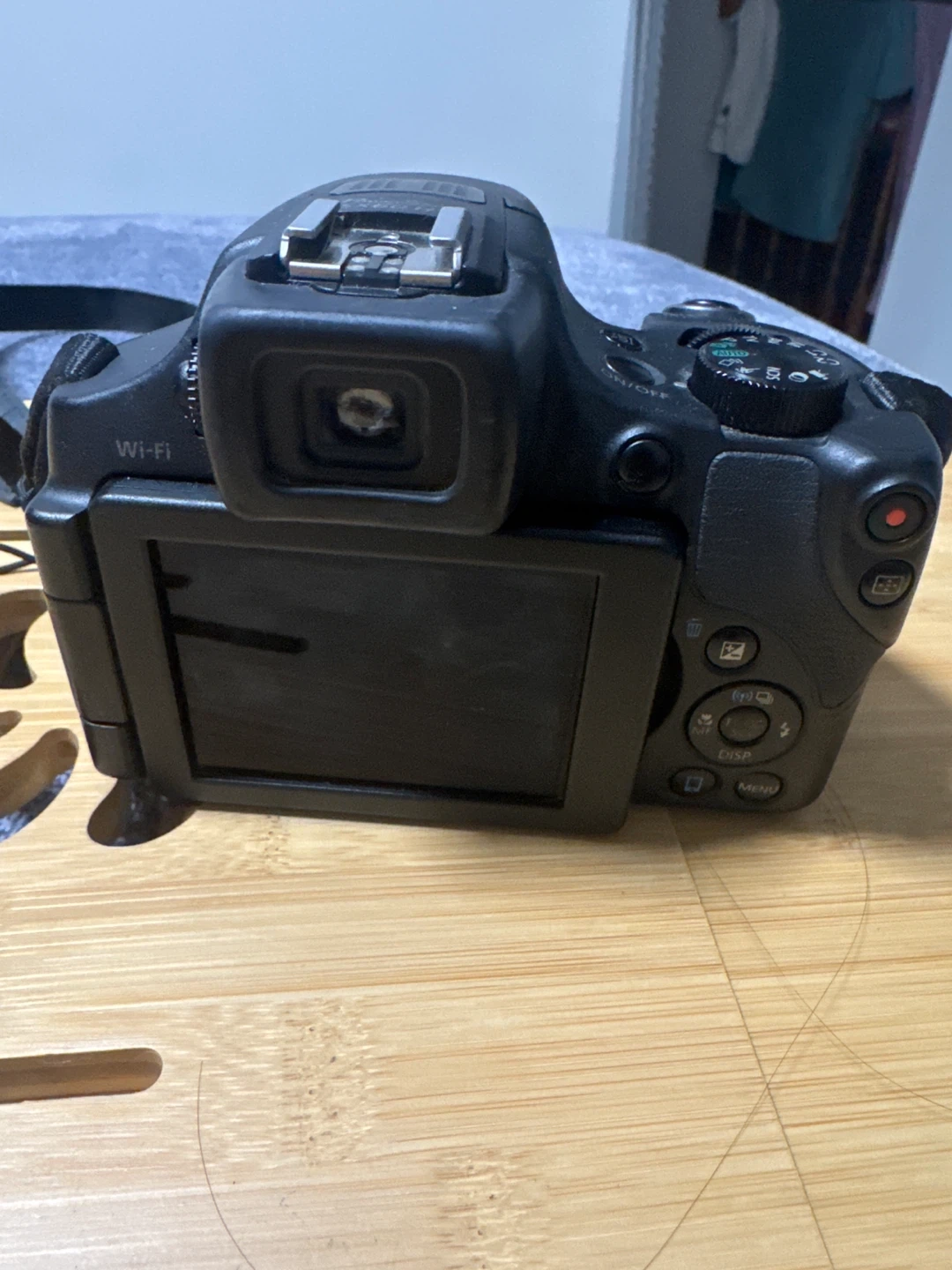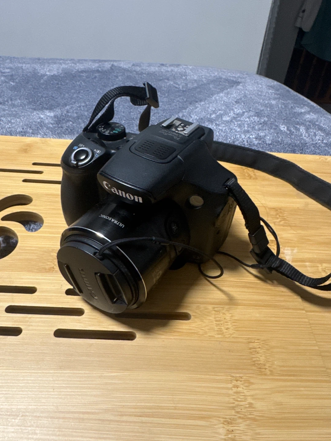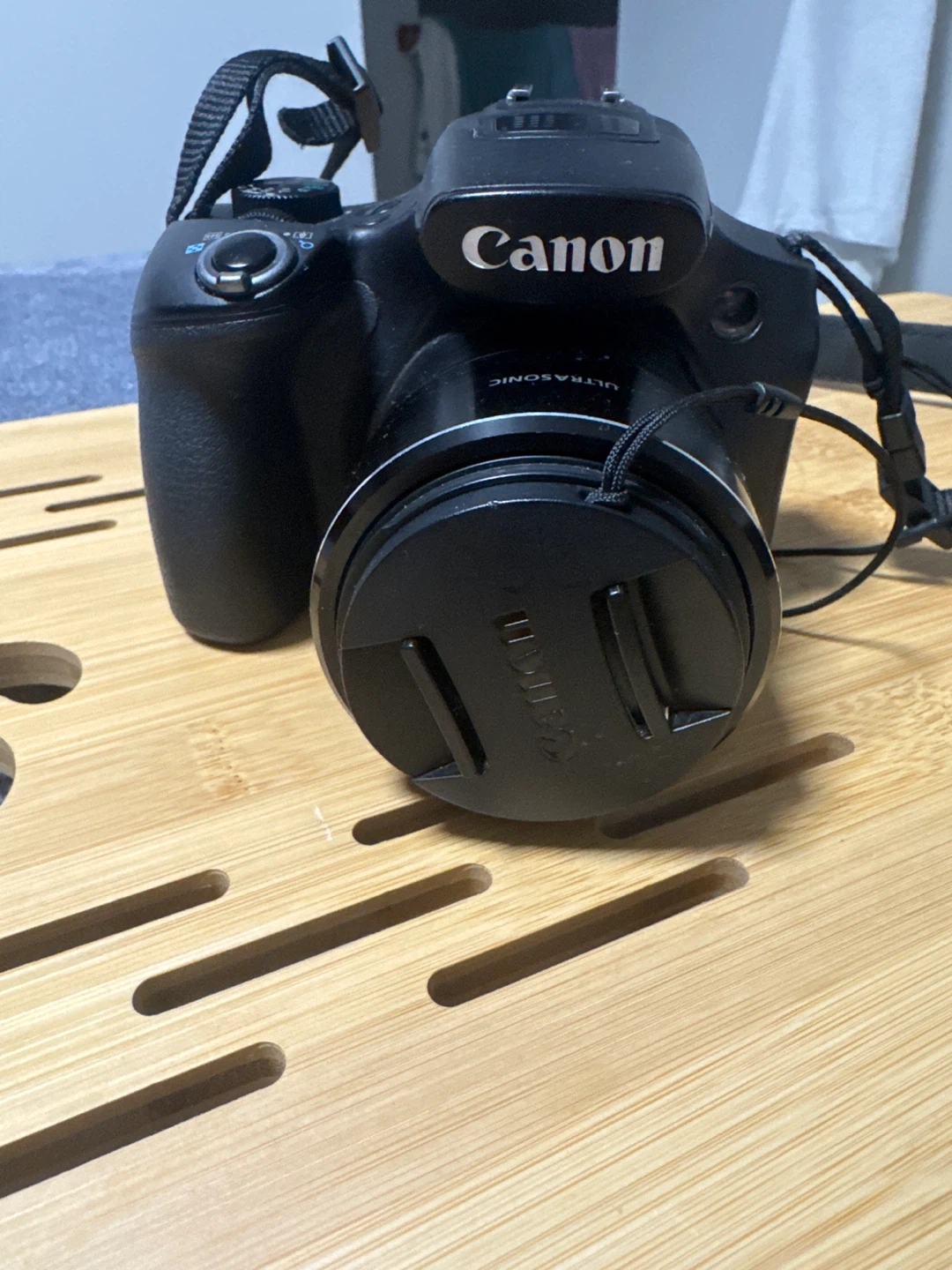Canon PowerShot SX60 HS digital camera with 65x optical zoom lens. Features Wi-Fi connectivity and Full HD video recording. Includes strap and battery.