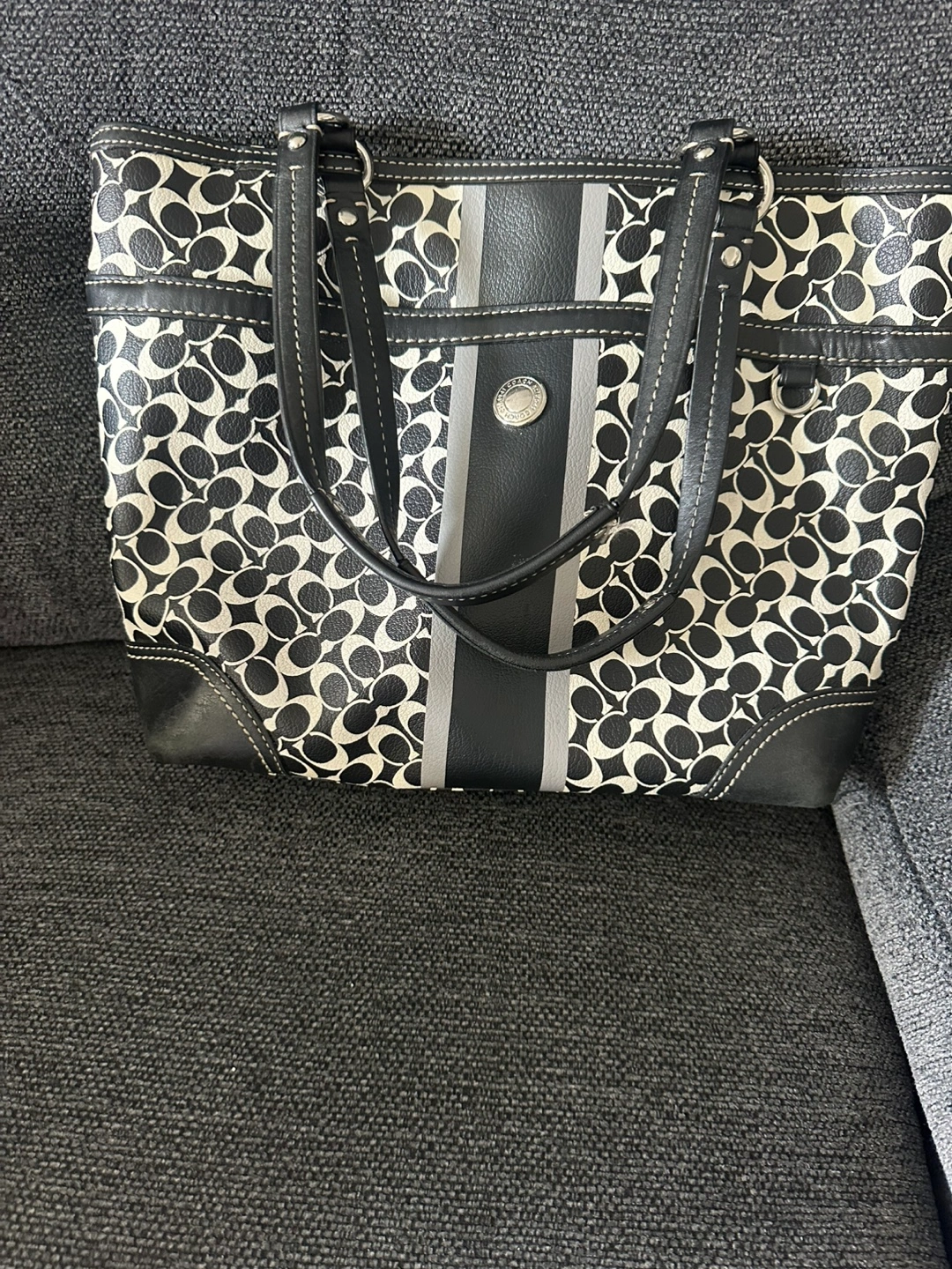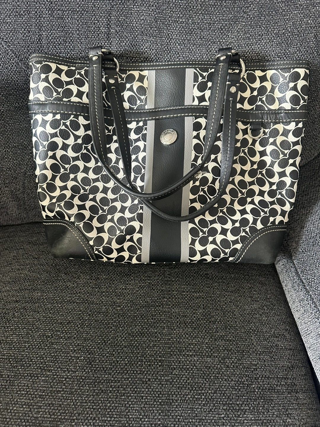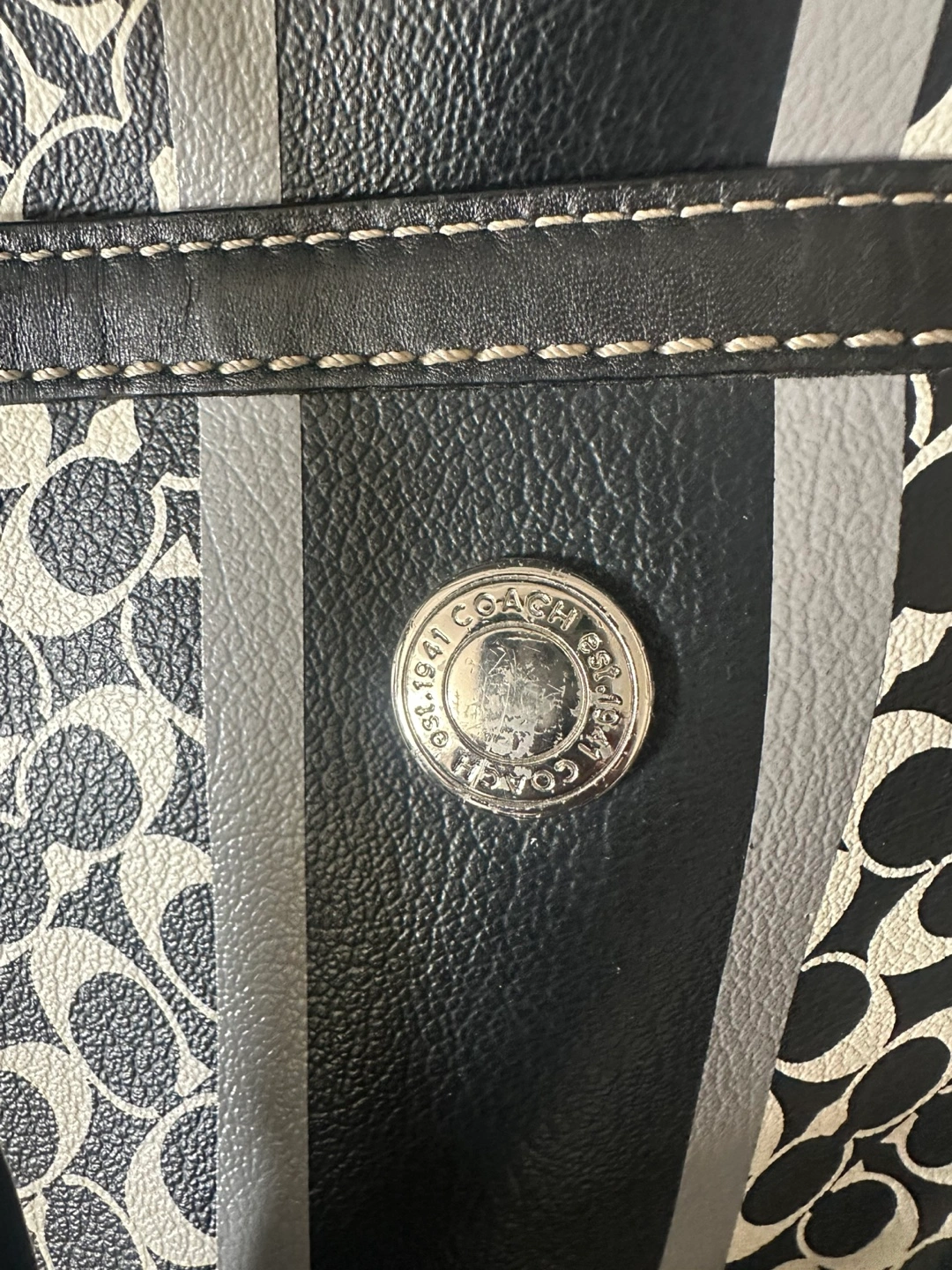 Medium Coach tote bag. Black and white signature. Features leather accents and double handles. Great everyday bag.