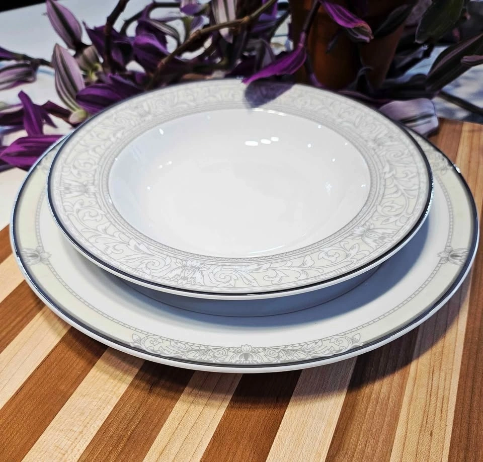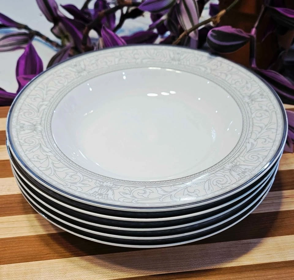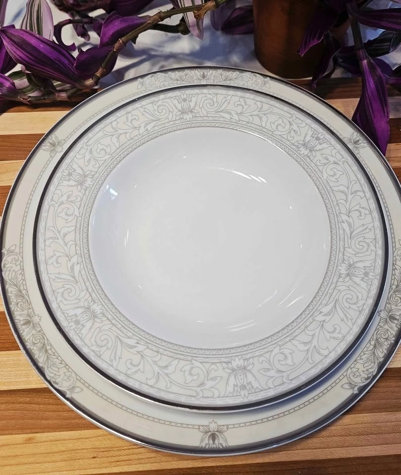 Features delicate gray scrolls and a stunning platinum rim. Set includes 6 dinner plates (10.5") and 5 salad/dessert plates (8.5"). Condition is 10/10, with no chips, cracks, or wear. Please check out my other postings! Bundle deals available if you buy multiple items!