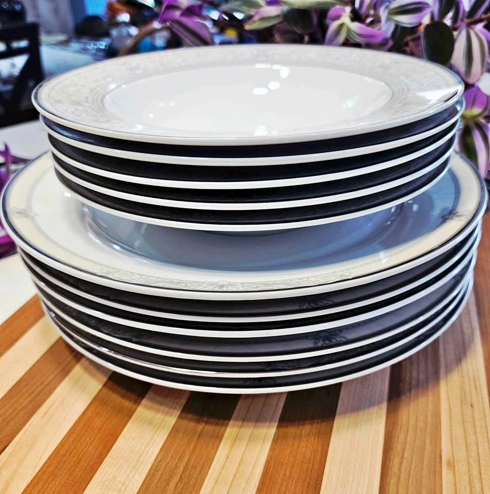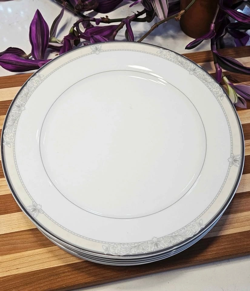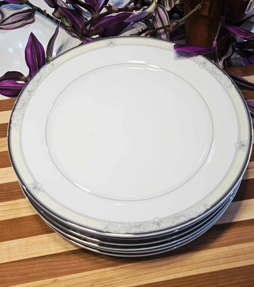 Features delicate gray scrolls and a stunning platinum rim. Set includes 6 dinner plates (10.5") and 5 salad/dessert plates (8.5"). Condition is 10/10, with no chips, cracks, or wear. Please check out my other postings! Bundle deals available if you buy multiple items!