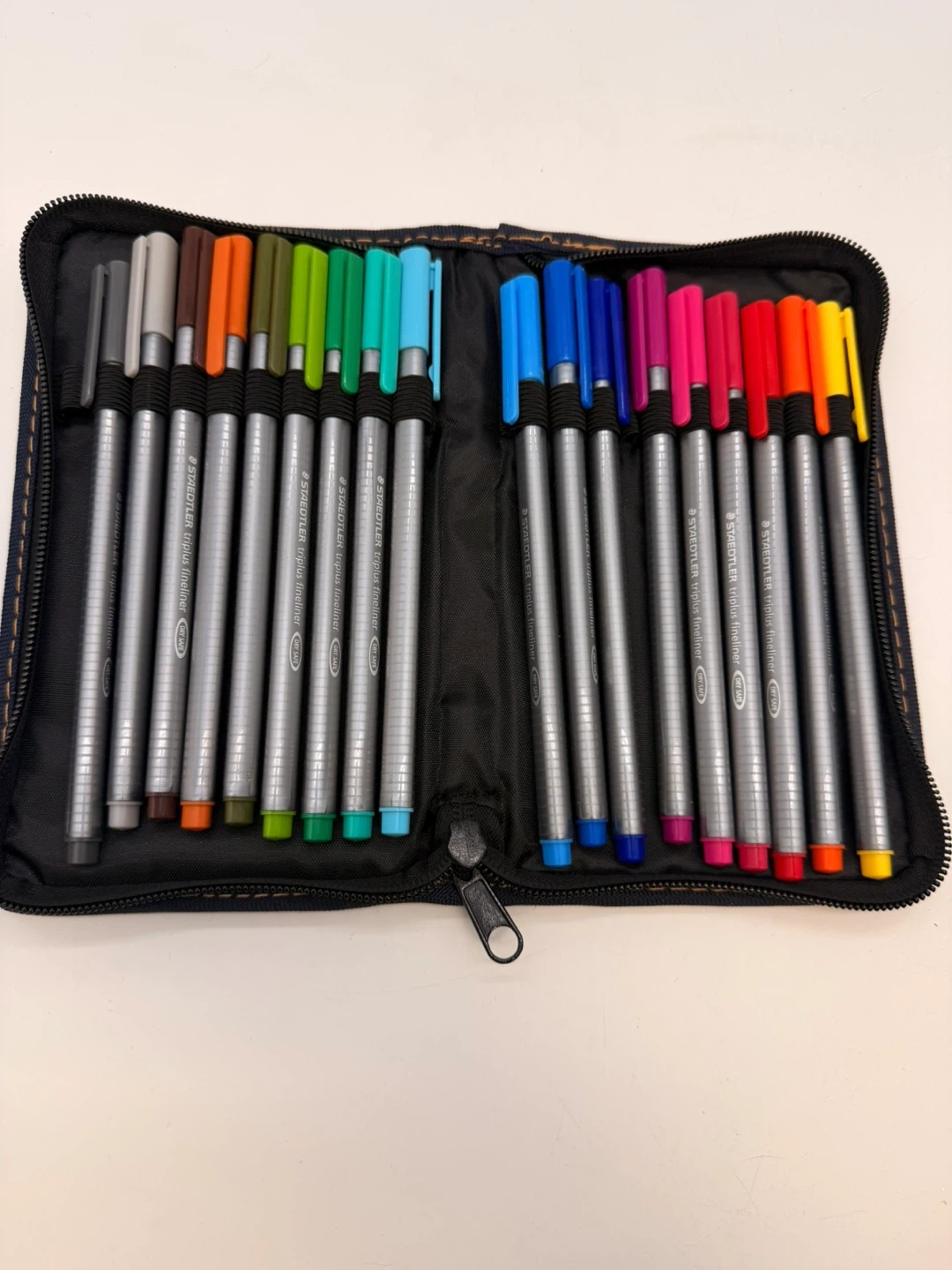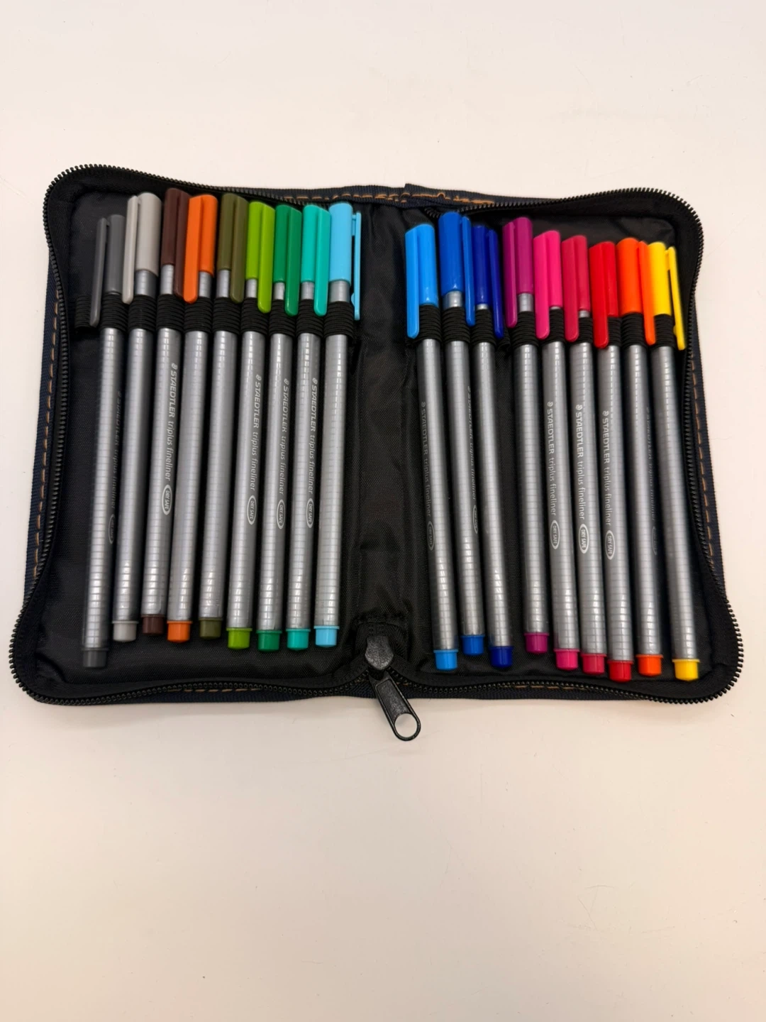 Staedtler Triplus fineliner set with 18 colors in original denim zip case.