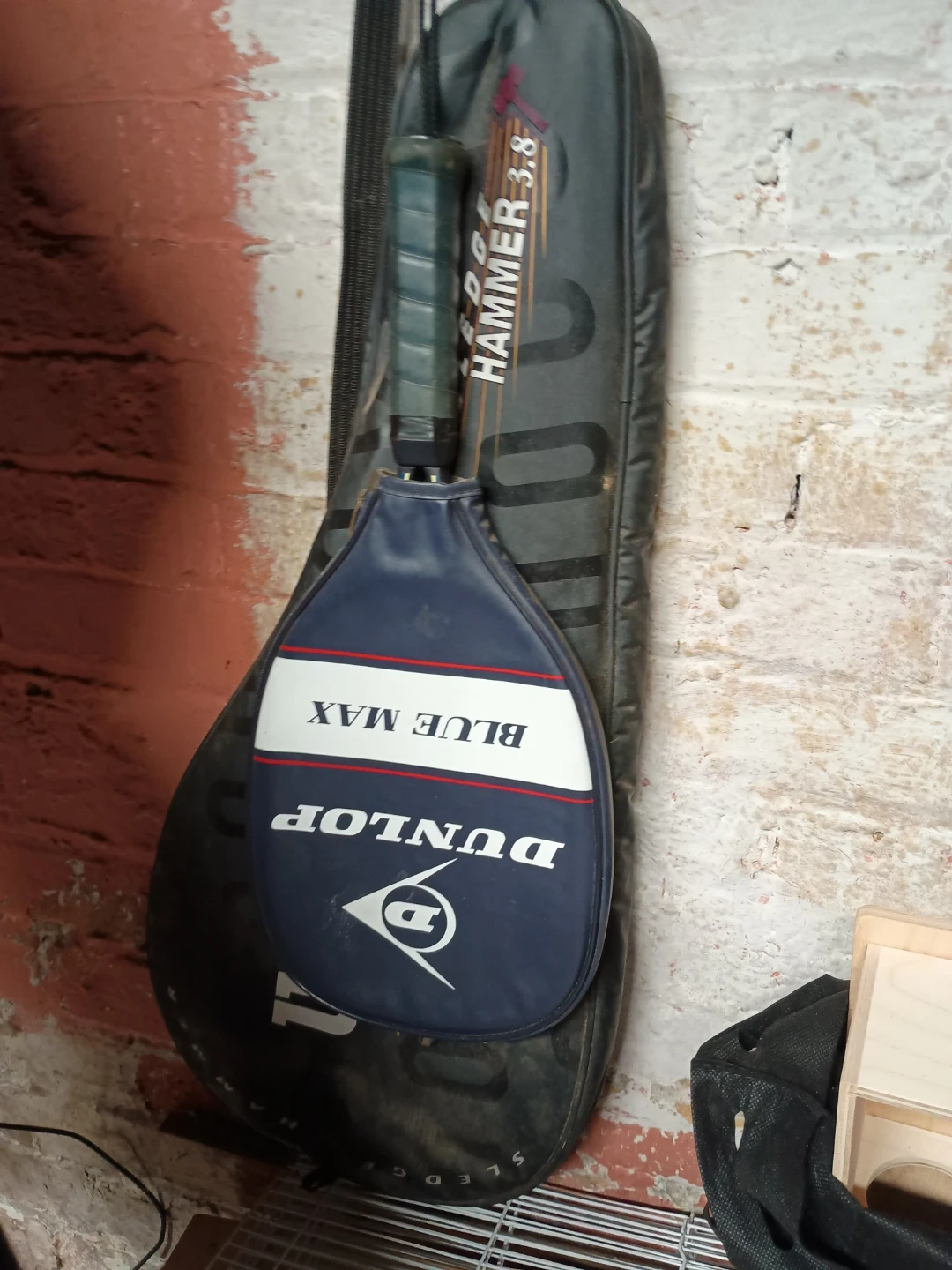 Dunlop Blue Max racquet with its original cover. This racquet appears to be a squash racquet. It's ready for play!