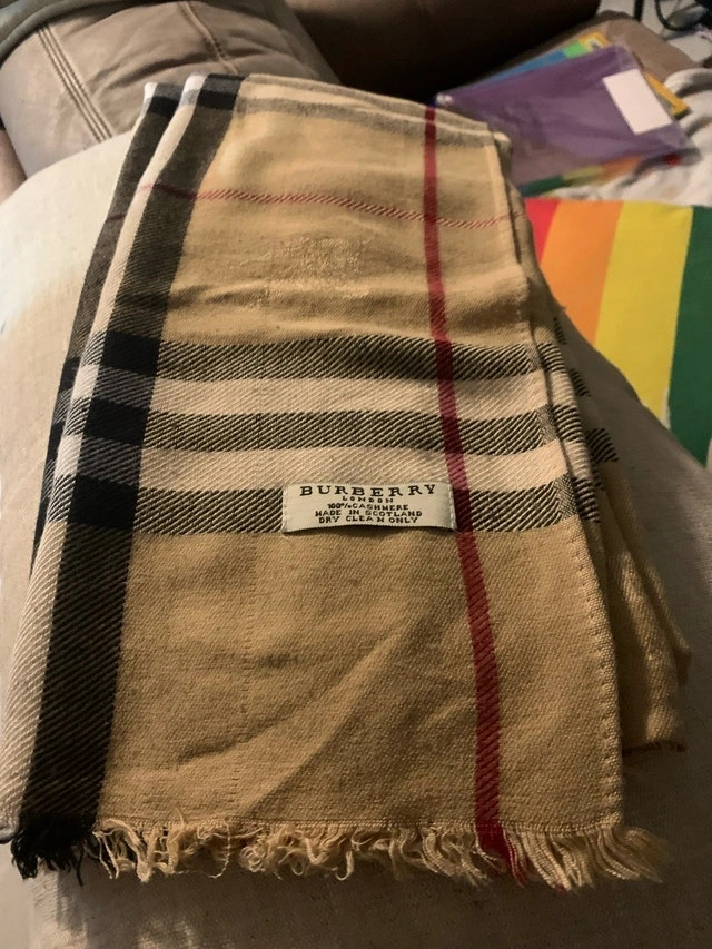 Add a touch of luxury to your wardrobe with this stylish Burberry scarf, made from 100% cashmere in Scotland. This scarf features the iconic Burberry check pattern. It is a used item, but it still has lots of life left! Grab this iconic scarf at a fraction of the retail price. Material: 100% Cashmere. Made in Scotland. Design: Classic Burberry check. Let me know if you're interested!