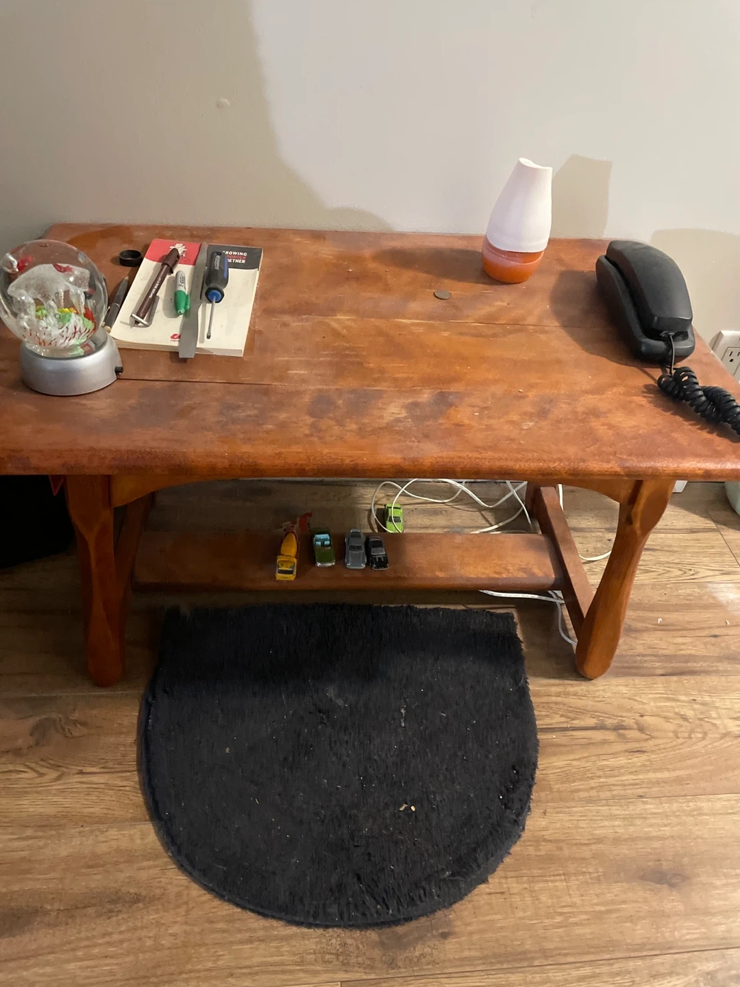 A simple wooden coffee table with a lower shelf. It's made of solid wood and has a warm, natural finish. Perfect for a living room or den!