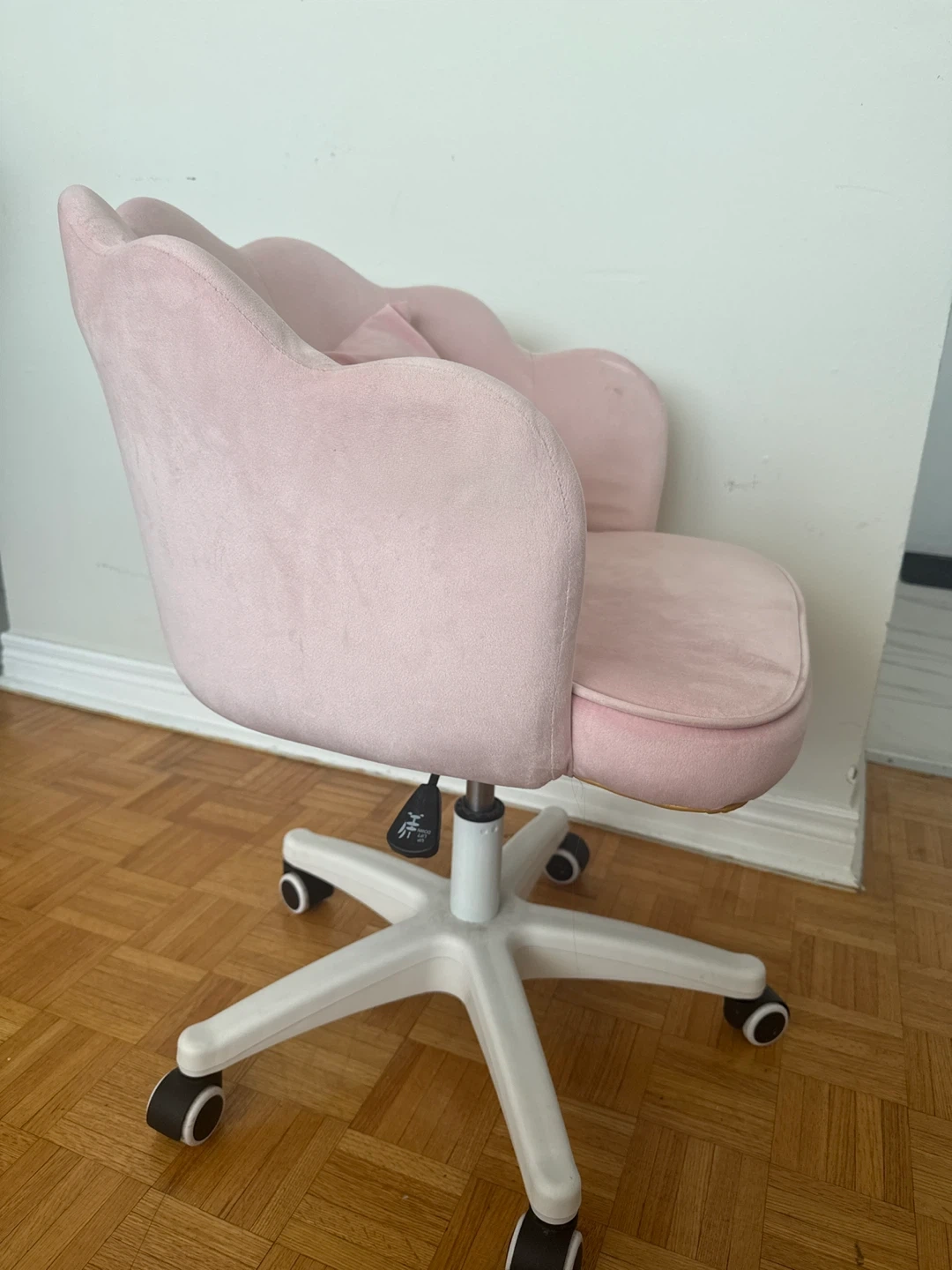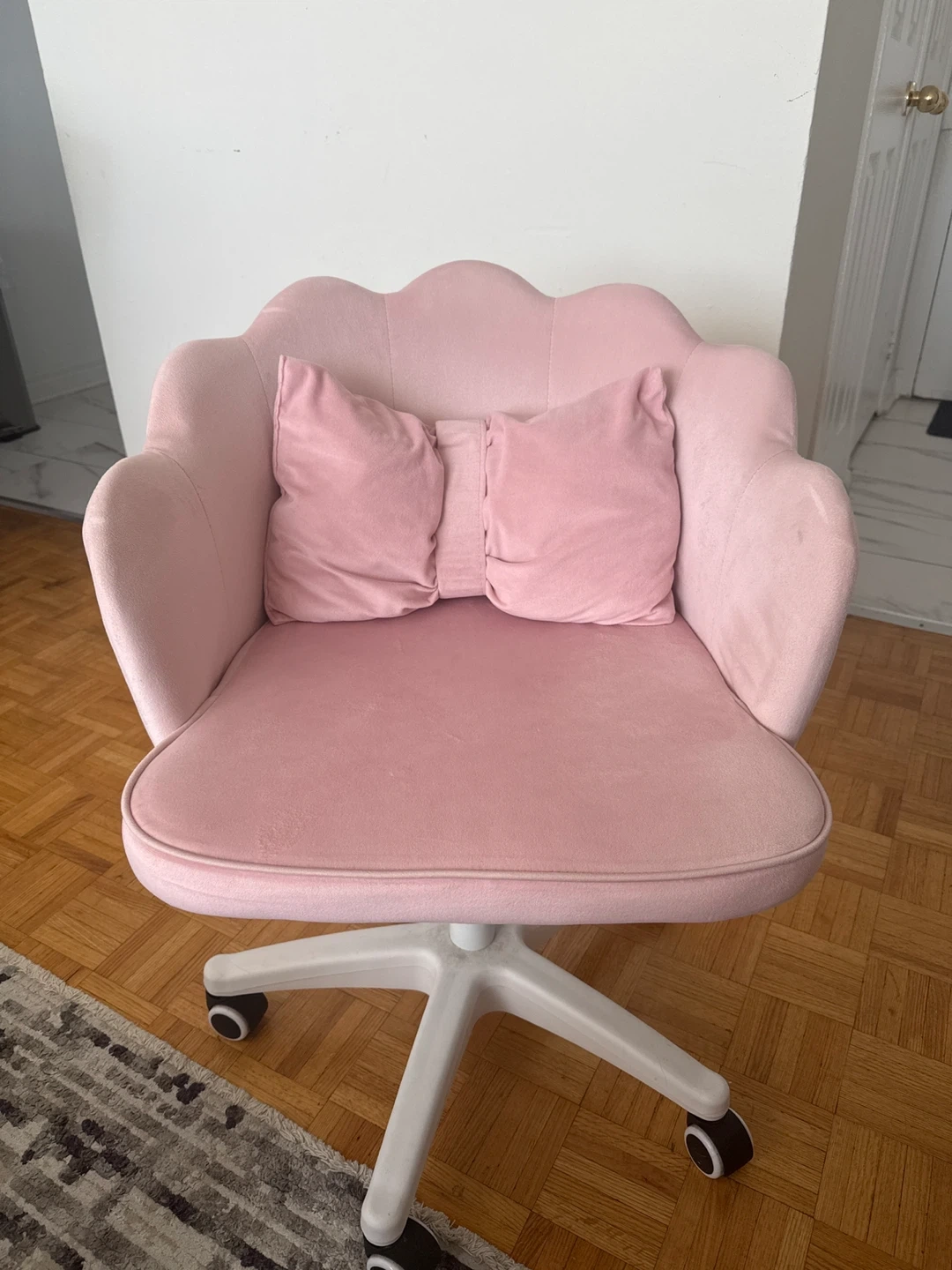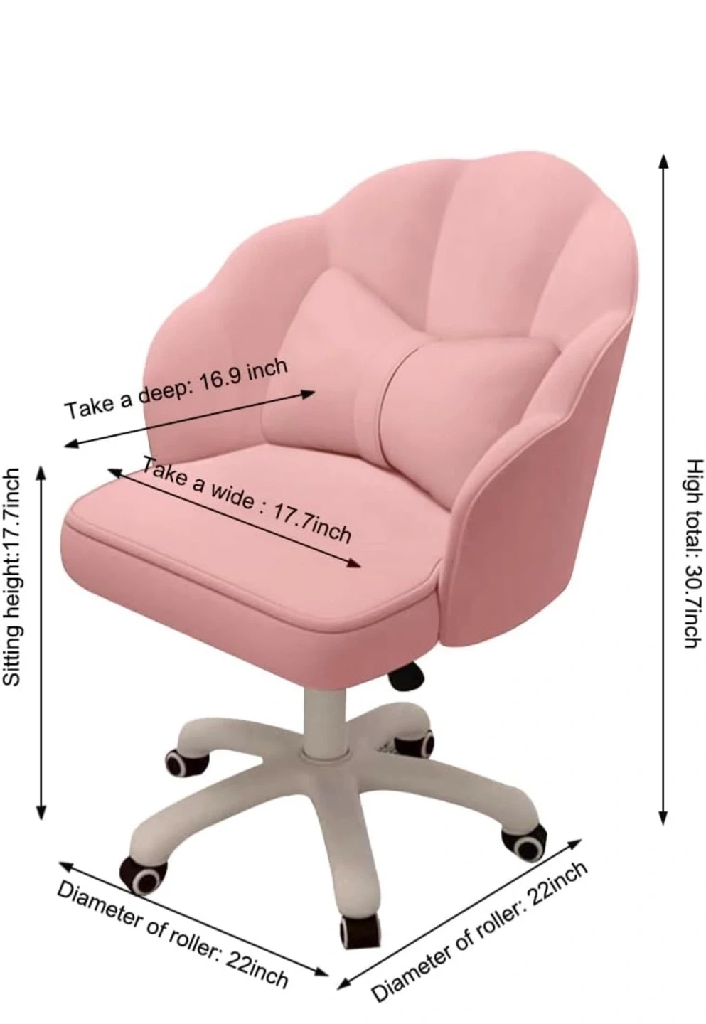 This cute pink velvet office chair features a unique shell design and comes with a decorative bow pillow. It has a sturdy base with rollers for easy mobility. Sitting height is 17.7 inches, and the overall height is 30.7 inches.