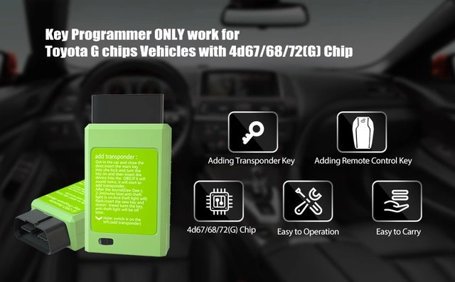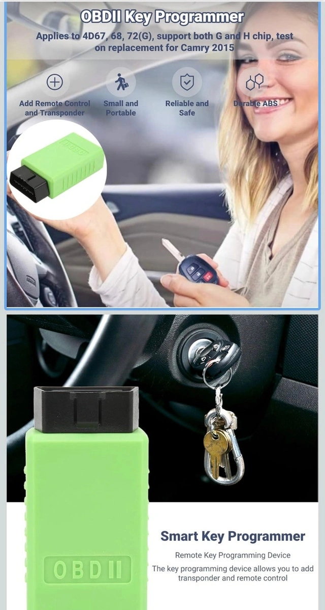 Professional portable transponder car key programming tool. High accuracy OBDII key programmer device for H and G chip. OBD2 remote key programmer applies to 4D67, 68, 72(G), supports both G and H chip. Tested on replacement for 2015 models.