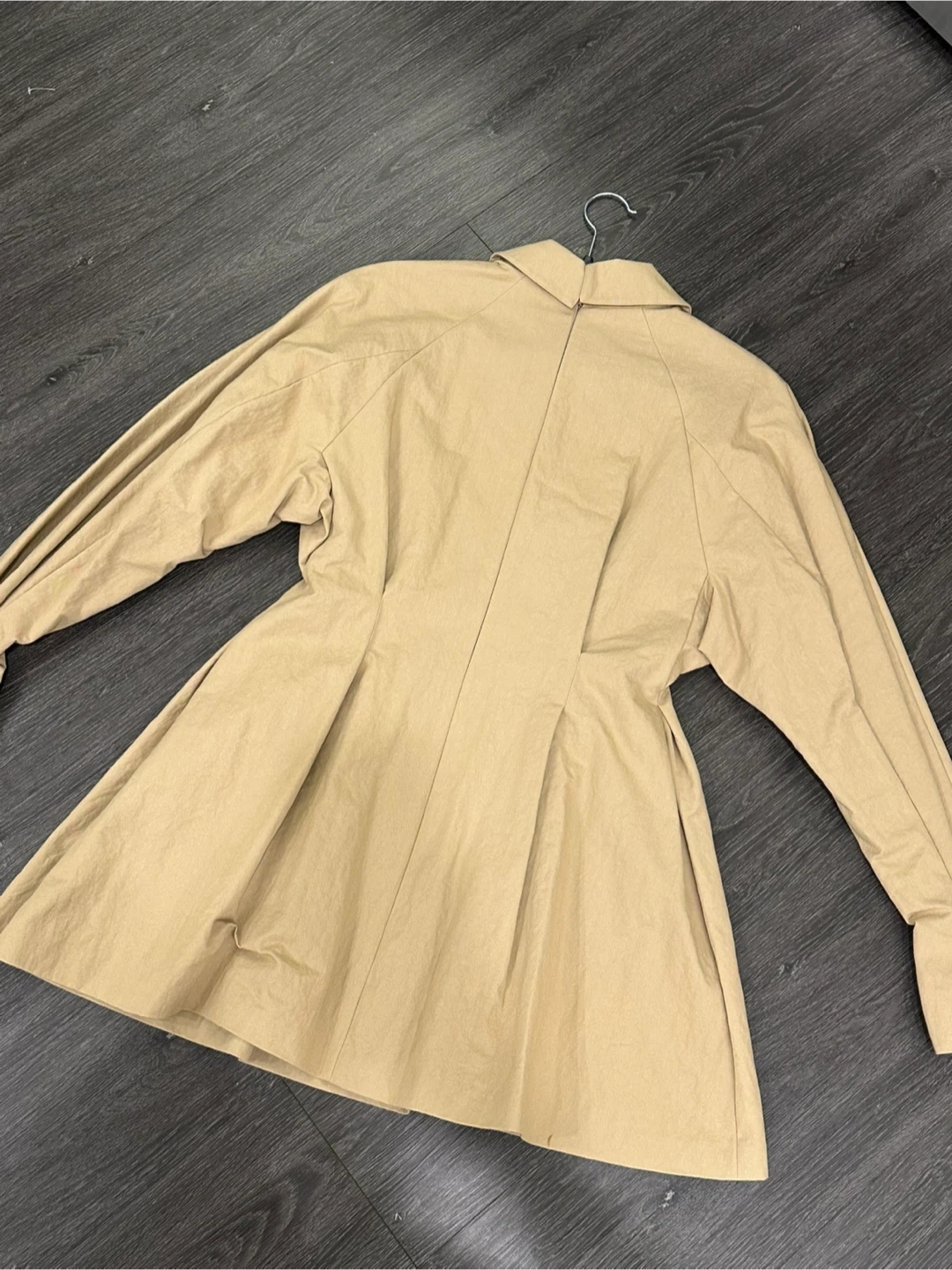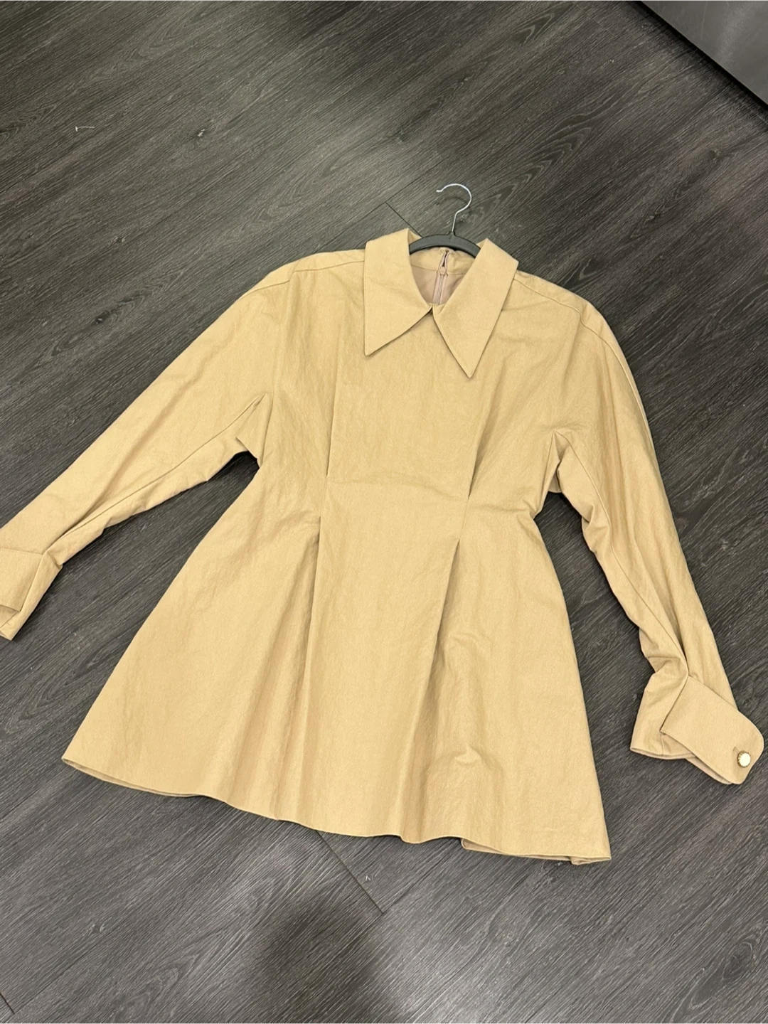 This is a brand new piece of clothing with the tags still attached. It is a high-quality Korean item with thick fabric, and you can wear it as a top or a mini dress. It has beautiful pleats and a sturdy material with luxurious buttons. I bought it for 170,000 KRW. The length is 80cm and the chest width is approximately 42cm.