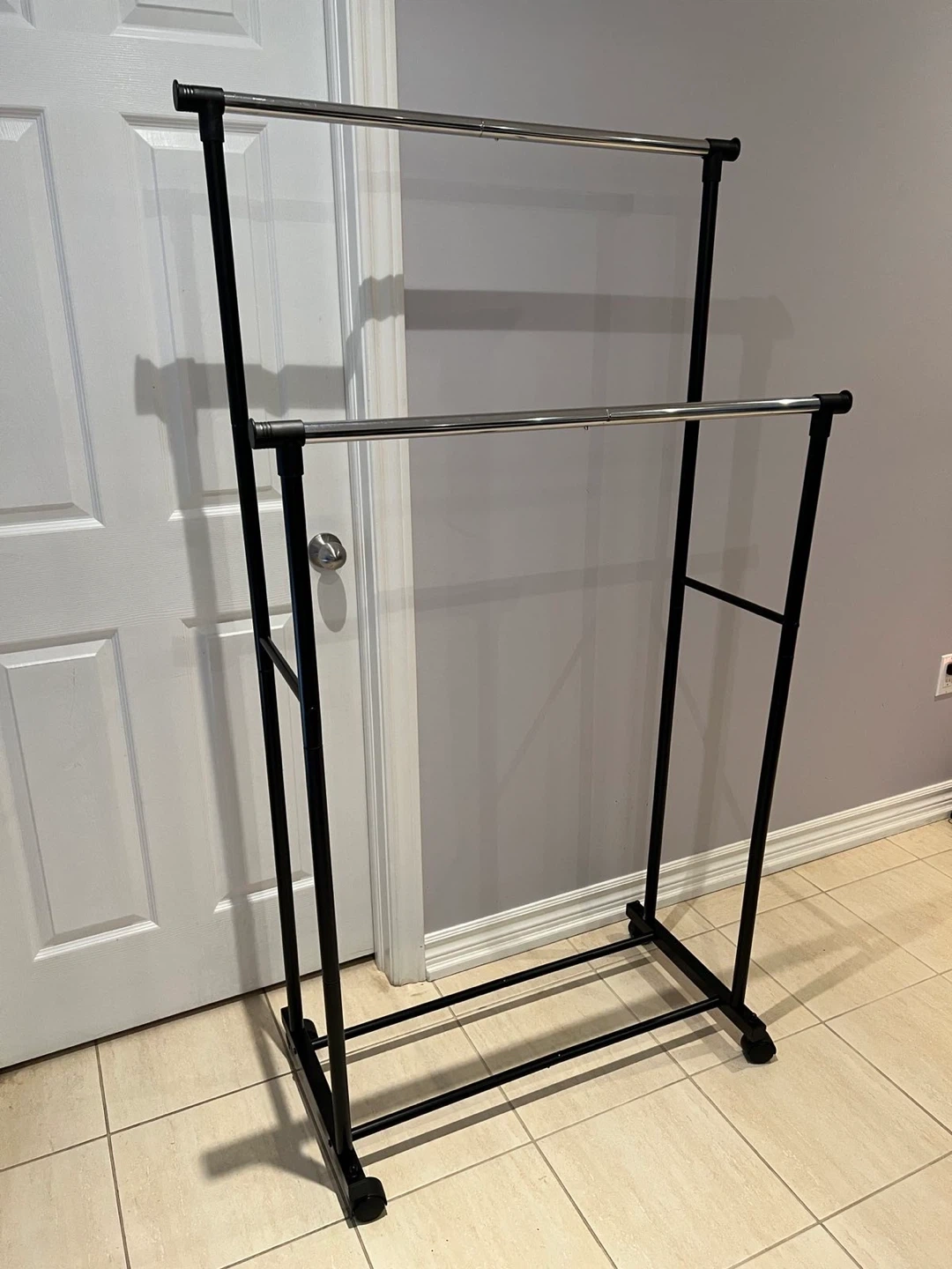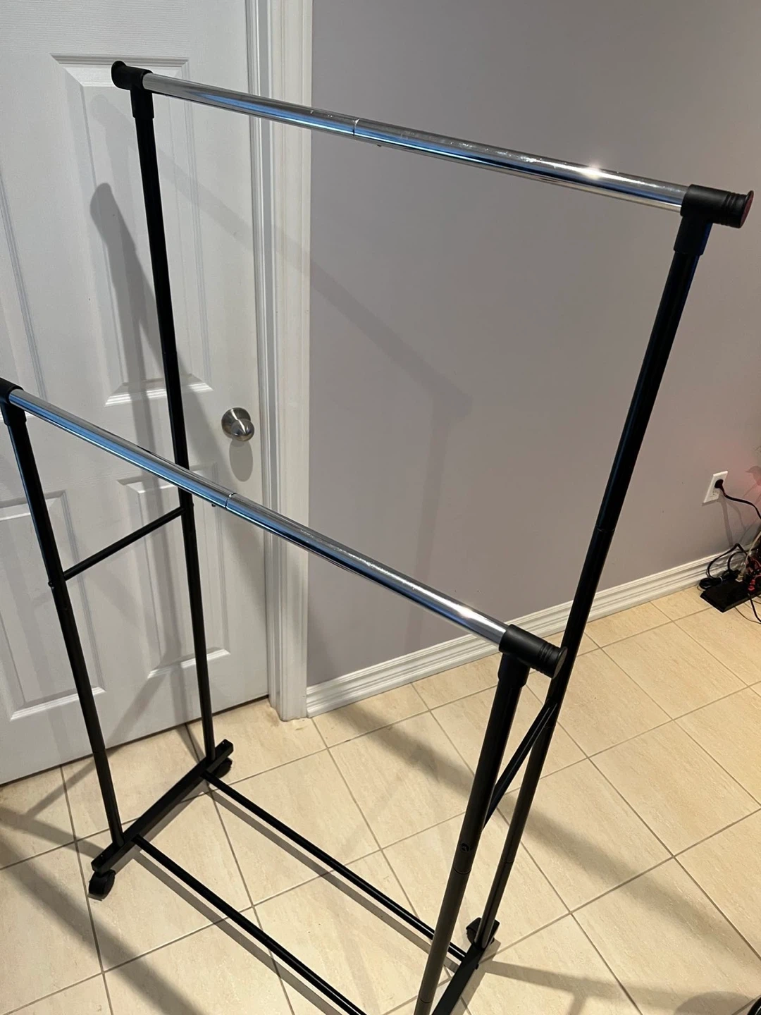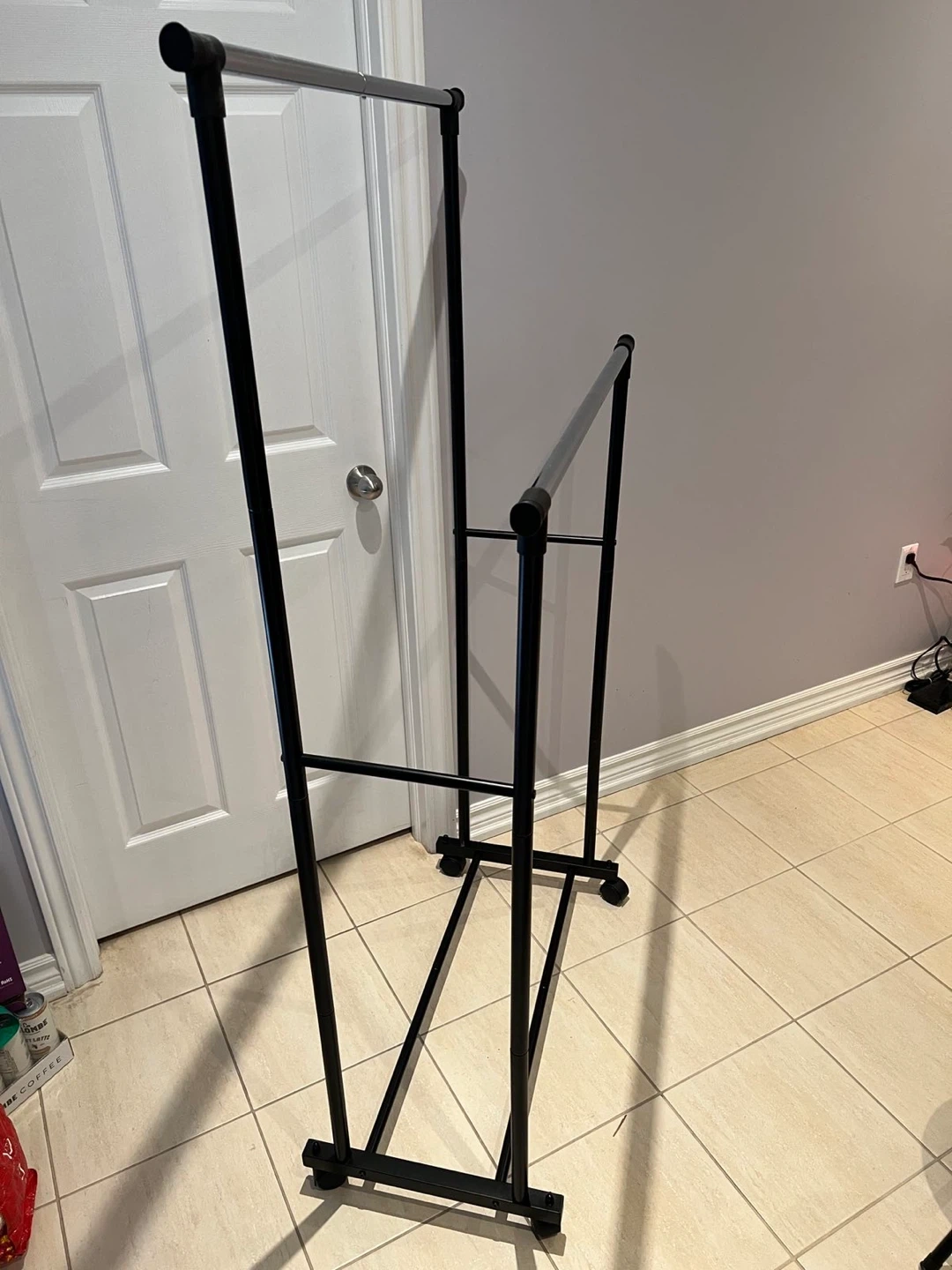 This is a black double garment rack. It has two hanging rails for clothes. The rack is on wheels for easy movement. It's approximately 63 inches tall. It provides lots of hanging space!