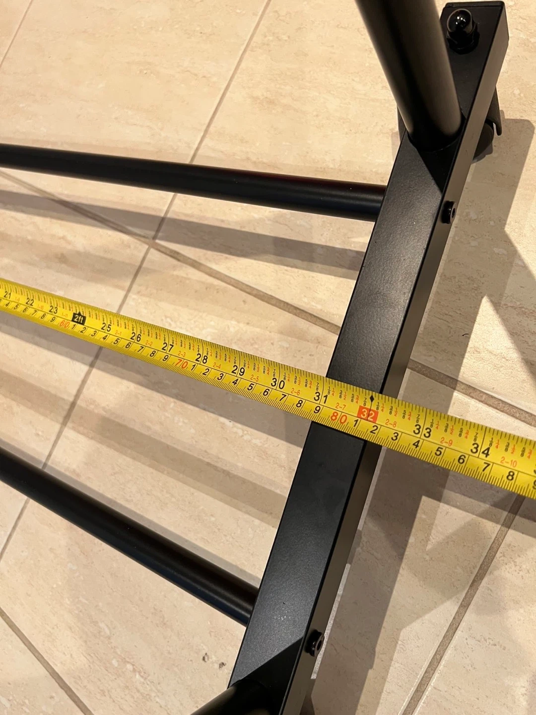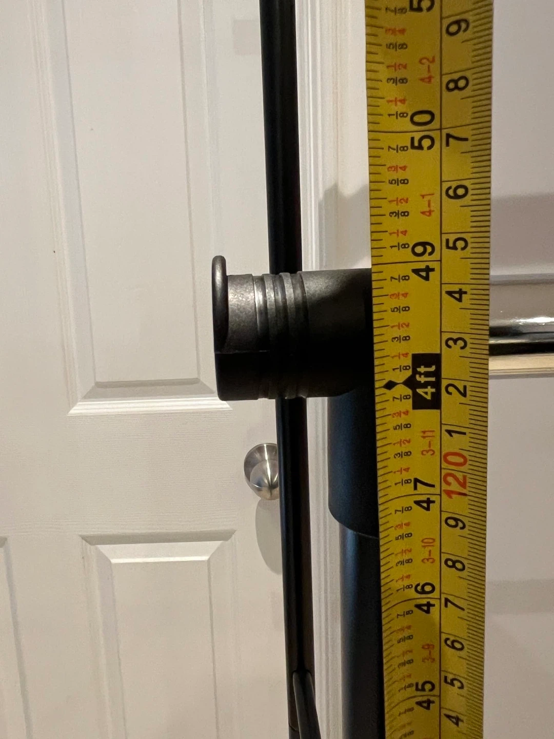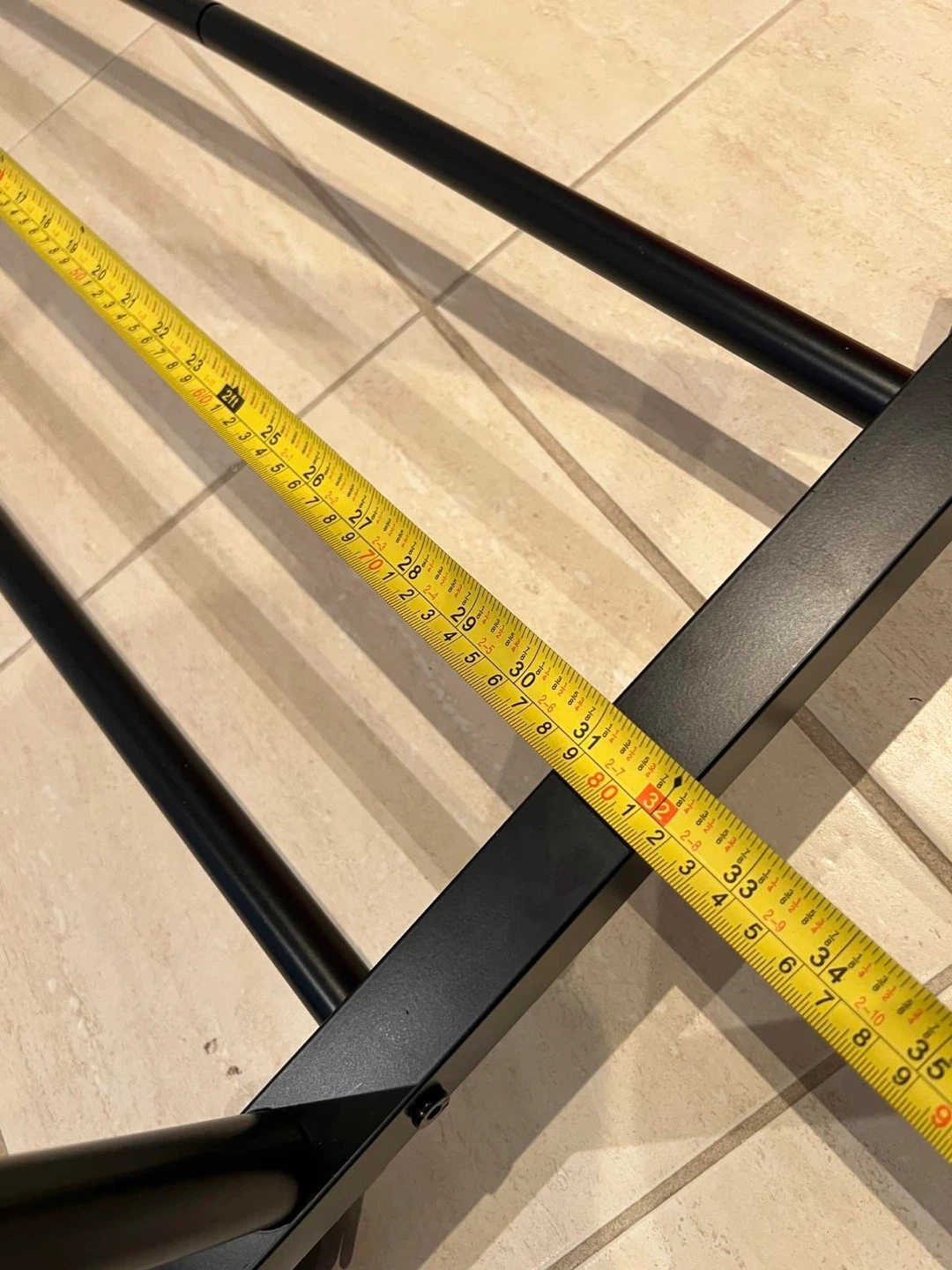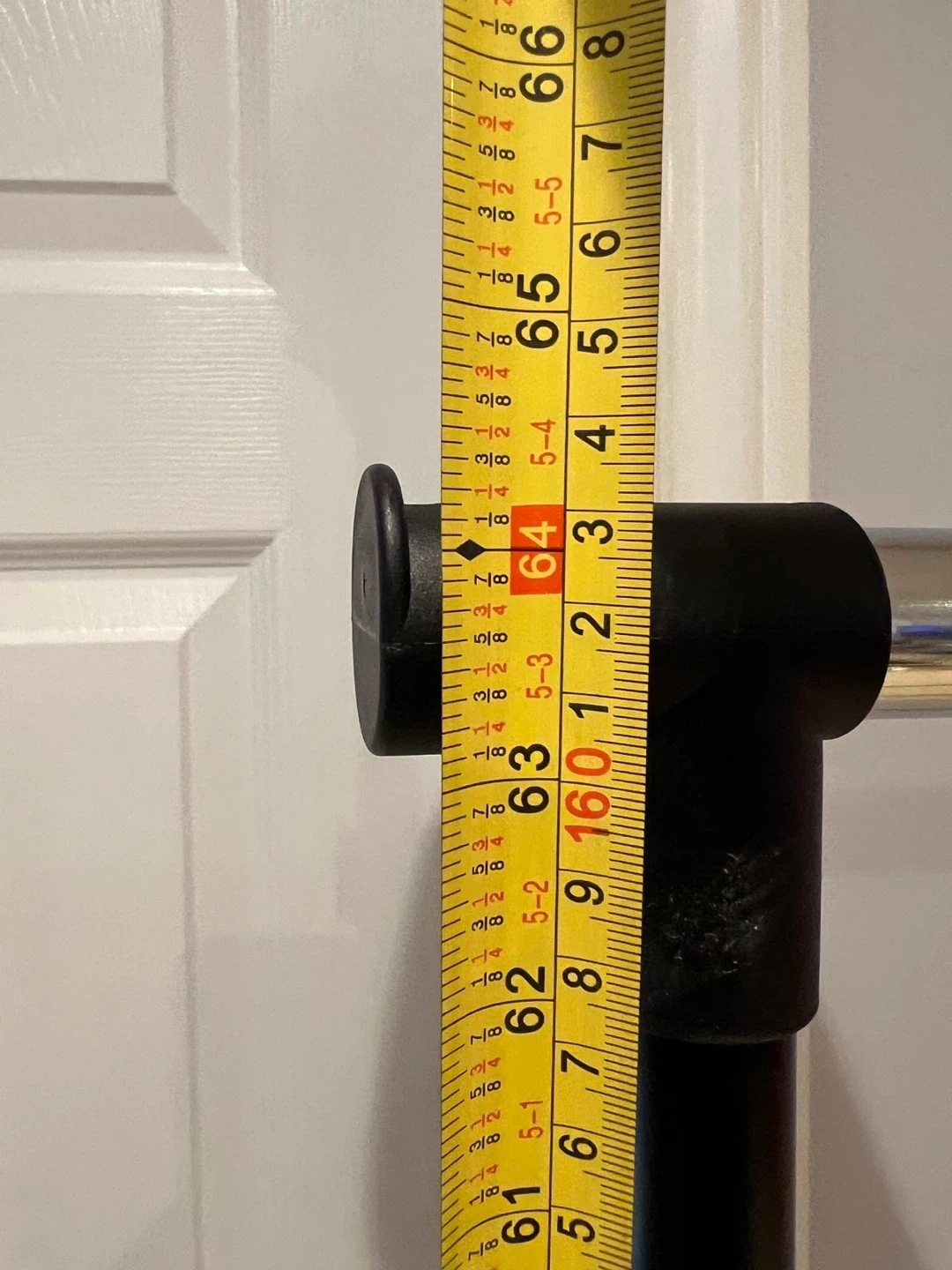 This is a black double garment rack. It has two hanging rails for clothes. The rack is on wheels for easy movement. It's approximately 63 inches tall. It provides lots of hanging space!