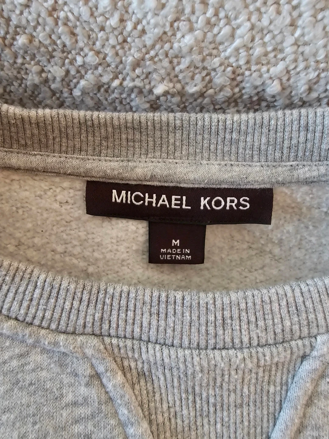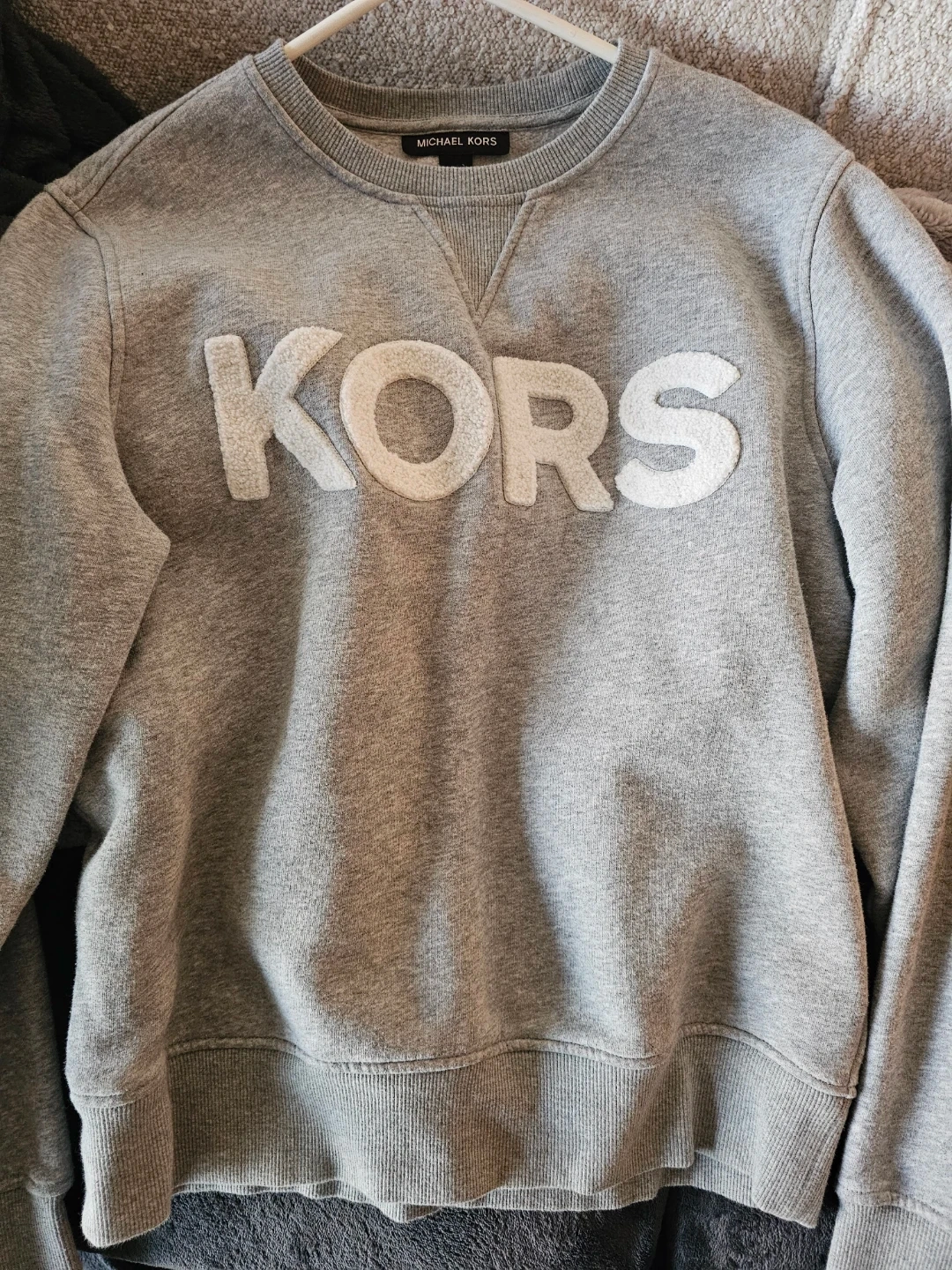 This is a Michael Kors crewneck sweatshirt in a heather grey colour. It features the "KORS" logo prominently on the front. The size is medium. It's made in Vietnam.