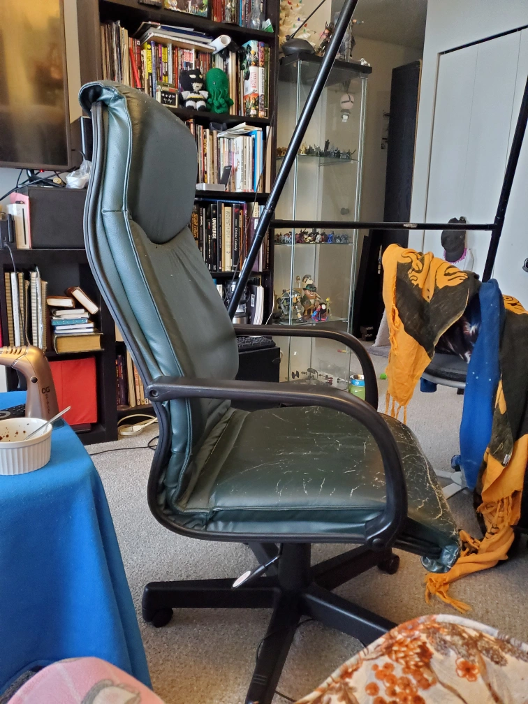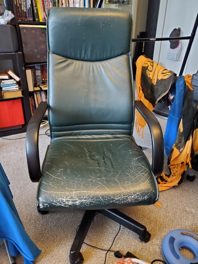 Used office chair. Pleather covering has been well loved by our cat, but the chair still rolls and reclines perfectly and is structurally stable.