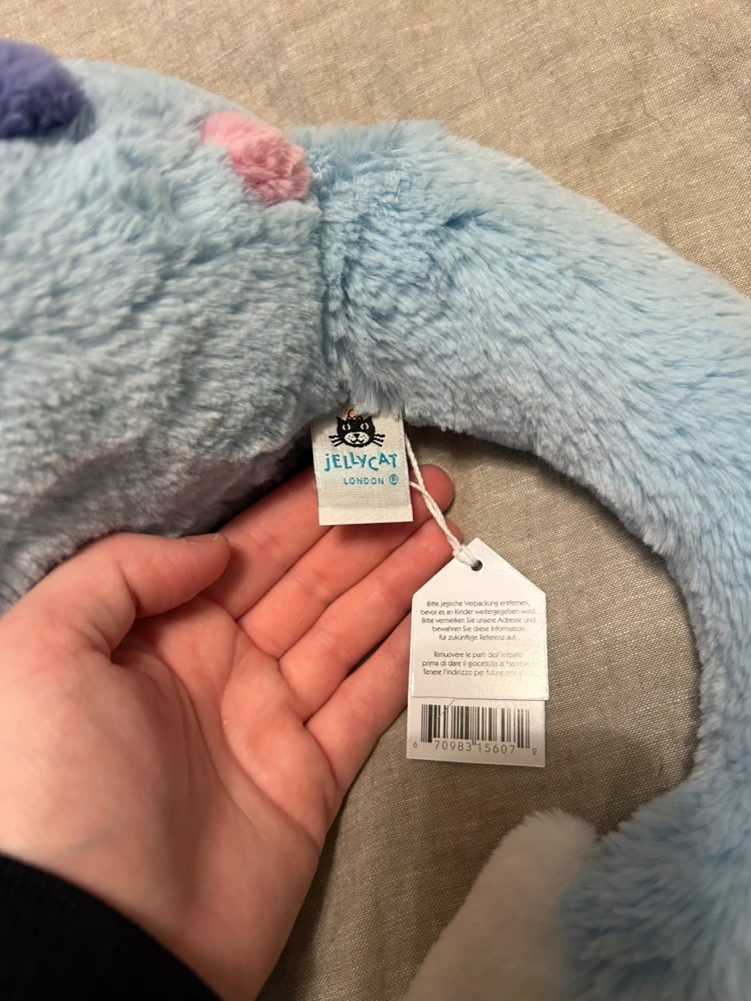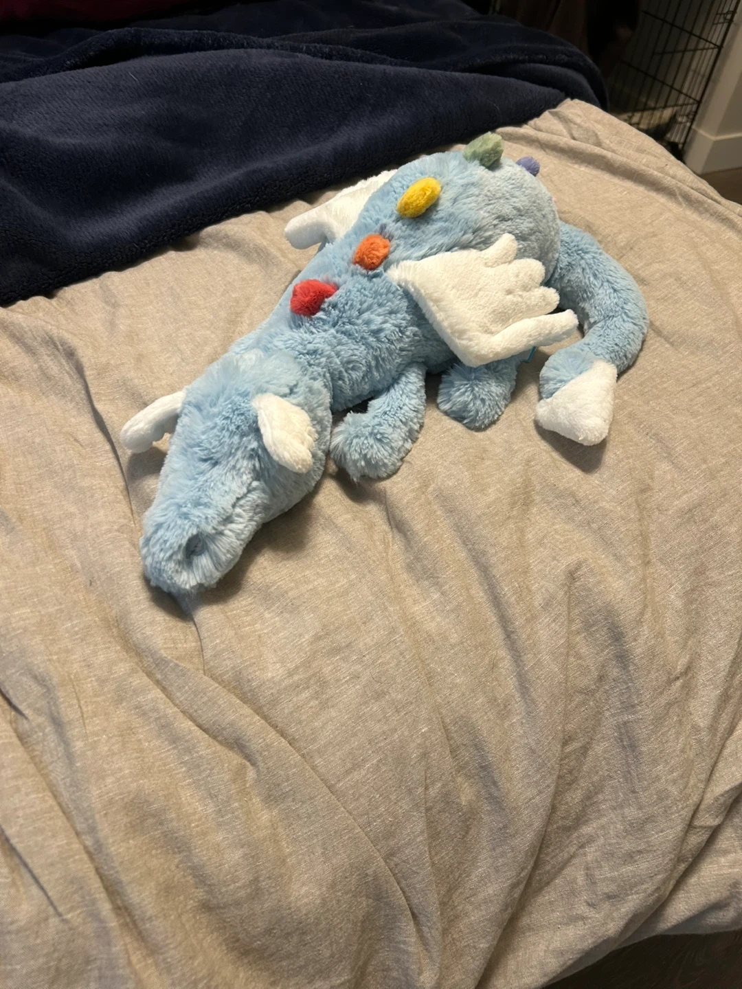 This is a Jellycat Sky Dragon plush toy. It's light blue with colourful accents and white wings. It's super soft and cuddly! Brand new